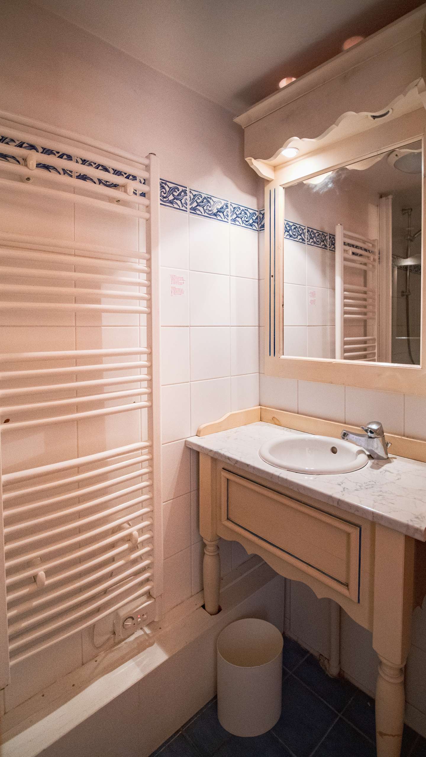 - Description: Salle de bain équipée d'une baignoire, d'un lavabo, d'un sèche serviettes et d'un toilette.