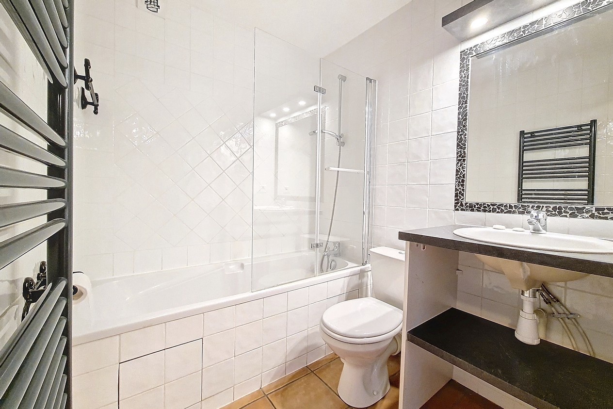 Salle de bain : avec baignoire et wc et sèche serviette mural.