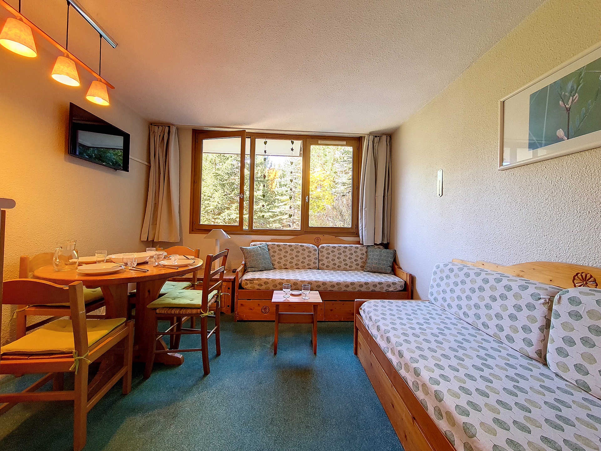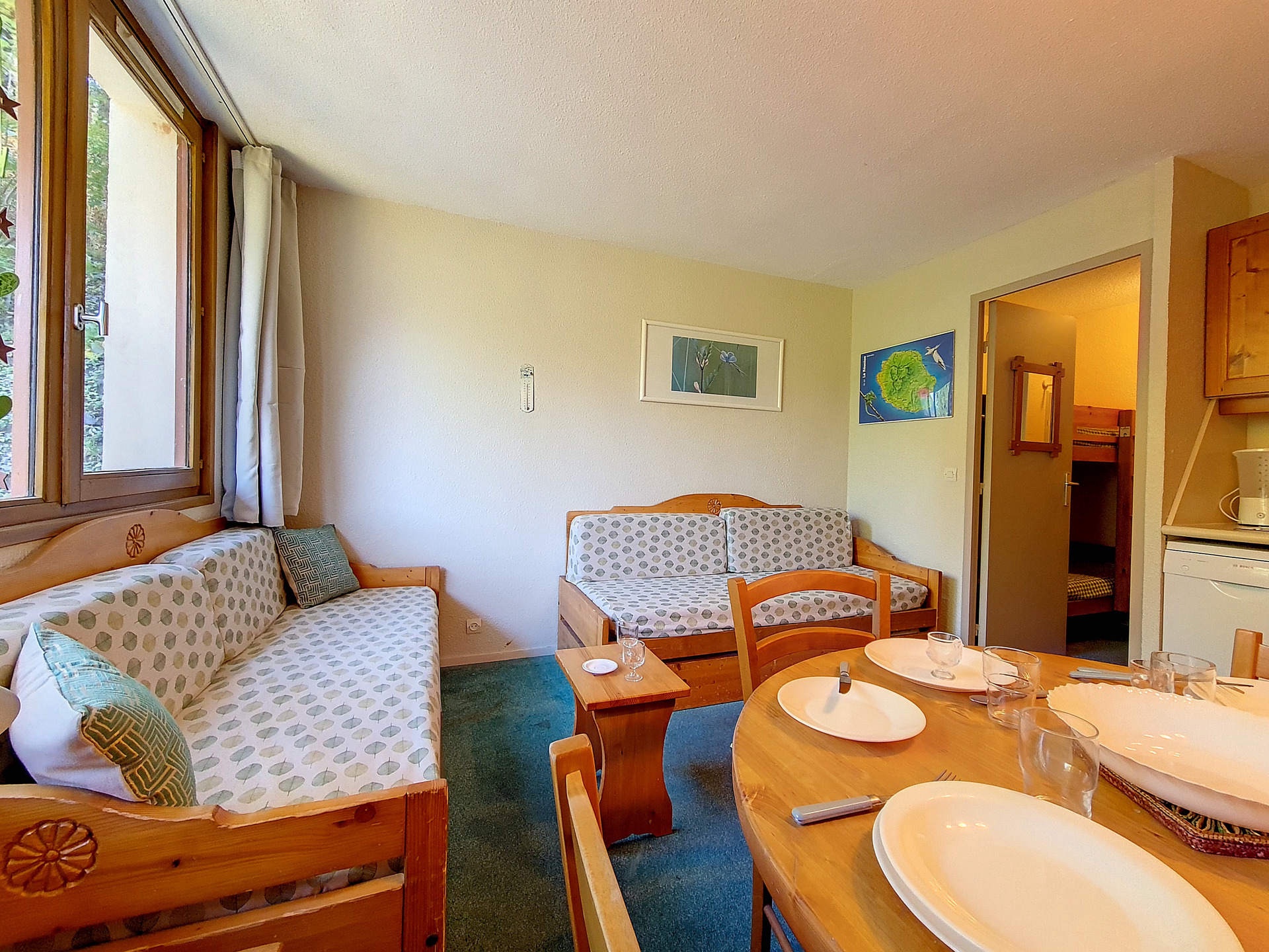 Séjour : 1 banquette-lit 1 personne et 1 lit gigogne 1 personne relevable. Equipé d'une télévision.