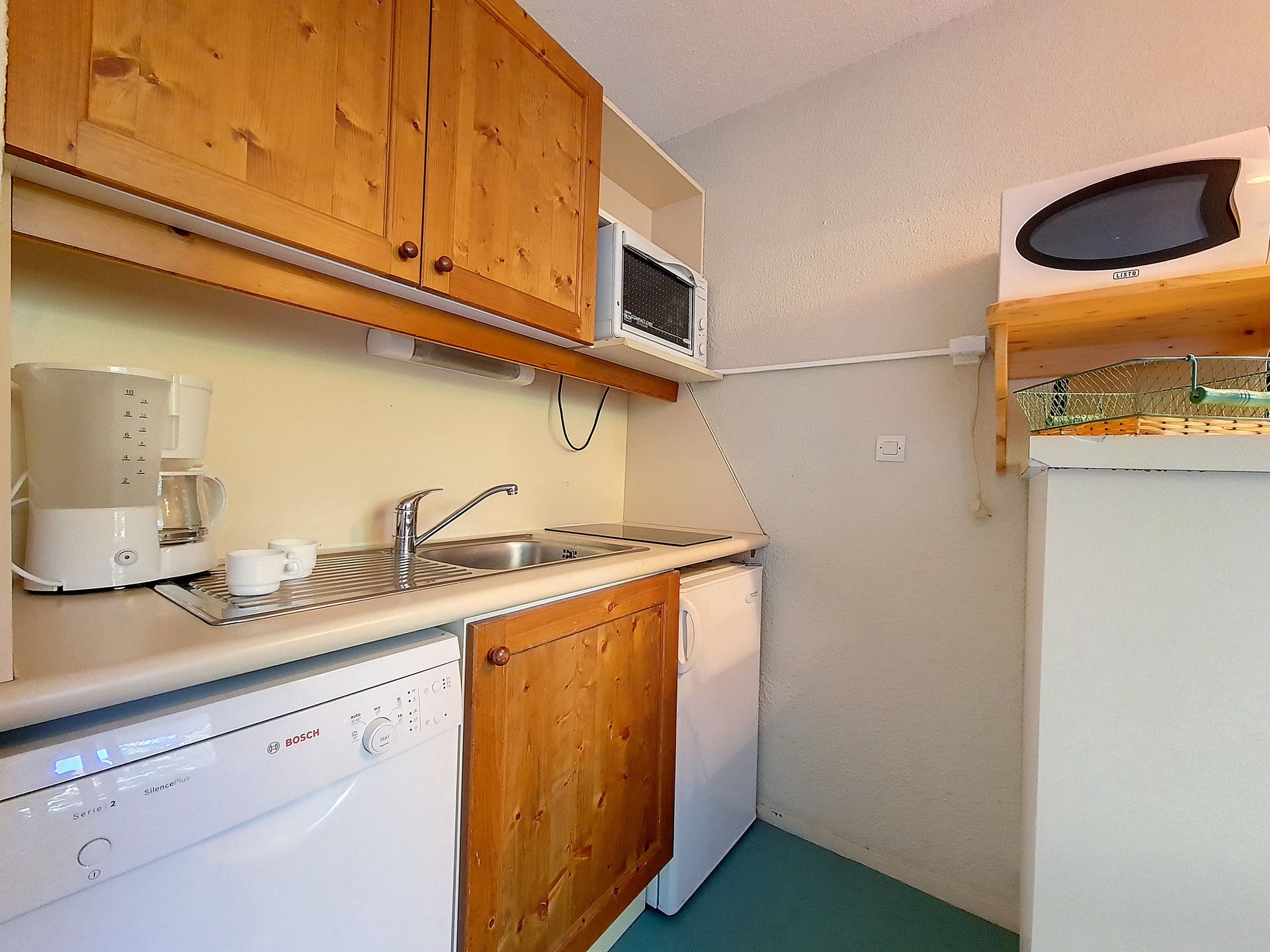 Cuisine équipée de 2 plaques électriques, mini-four, micro-ondes, réfrigérateur, lave-vaiselle, cafetière et grille-pain.