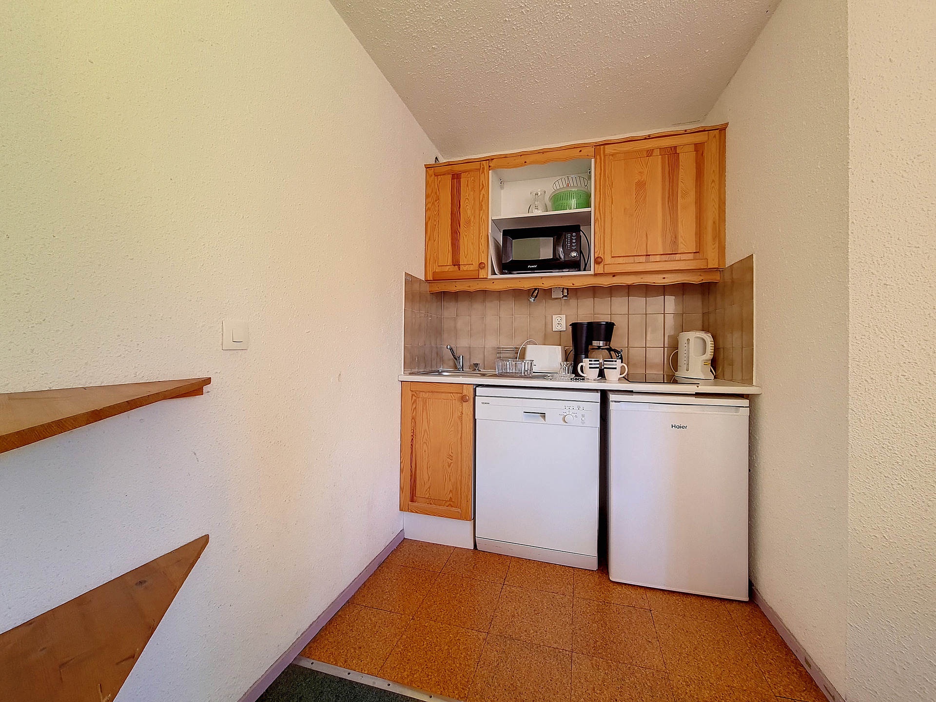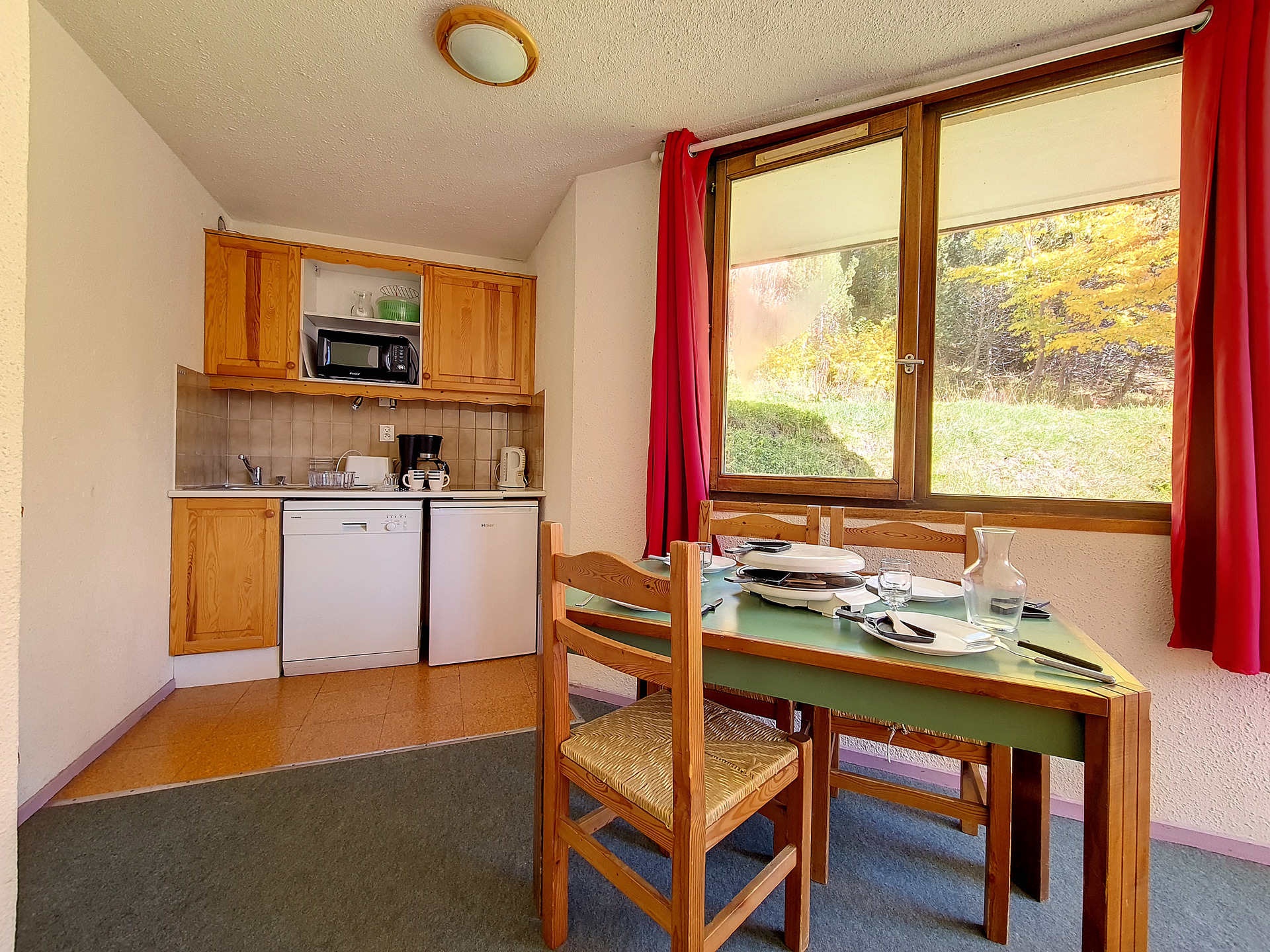 Cuisine équipée de 2 plaques vitro-céramiques, micro-ondes, réfrigérateur, lave-vaisselle, cafetière et bouilloire.