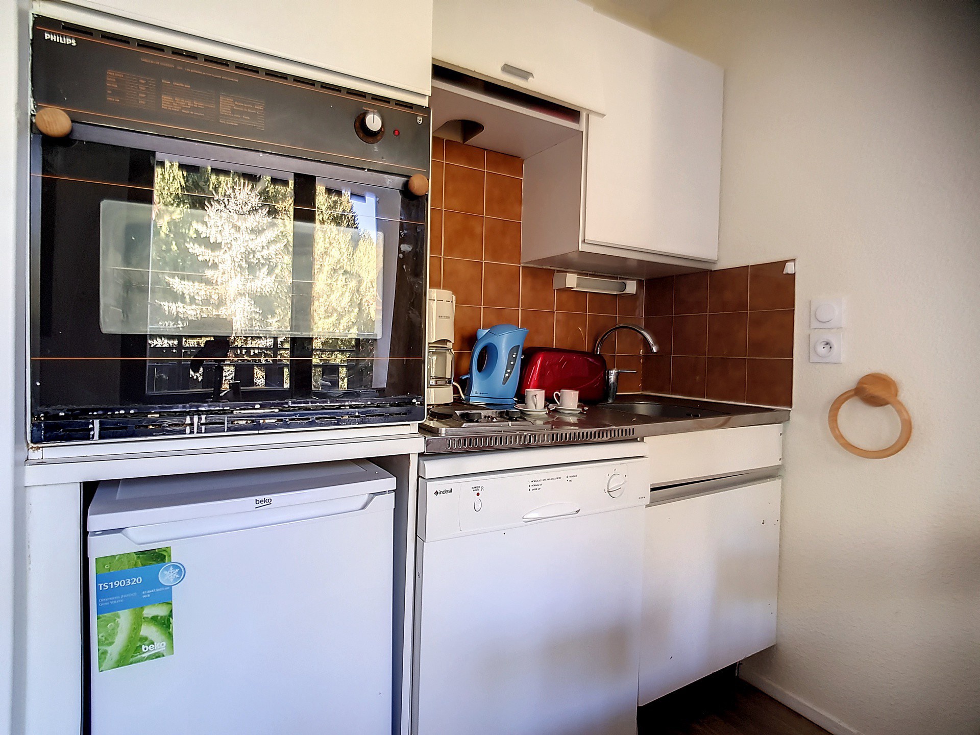 Cuisine équipée de 2 plaques, four, réfrigérateur, lave-vaisselle, bouilloire, grille-pain, cafetière.