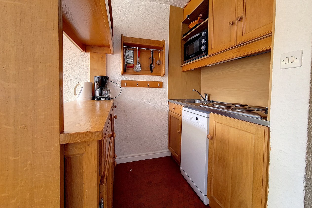 Cuisine incorporée 4 plaques, four, micro ondes, réfrigérateur et lave-vaisselle, grille-pain, bouilloire et cafetière.