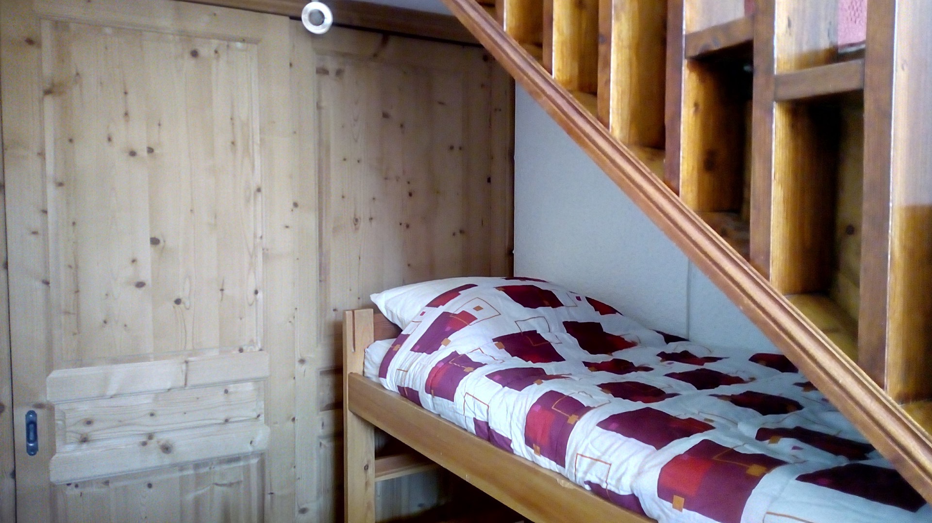 Coin montagne sous escalier : 2 lits simples superposés (70cm).