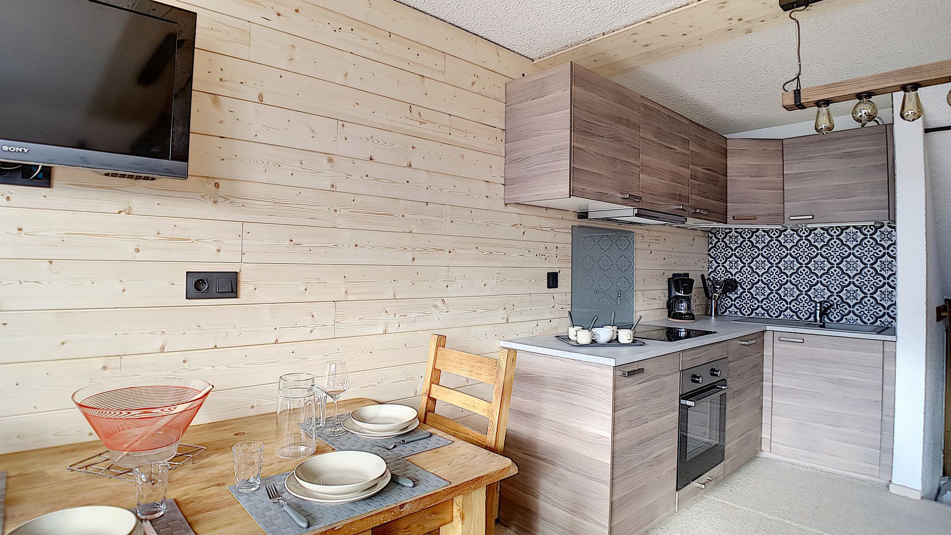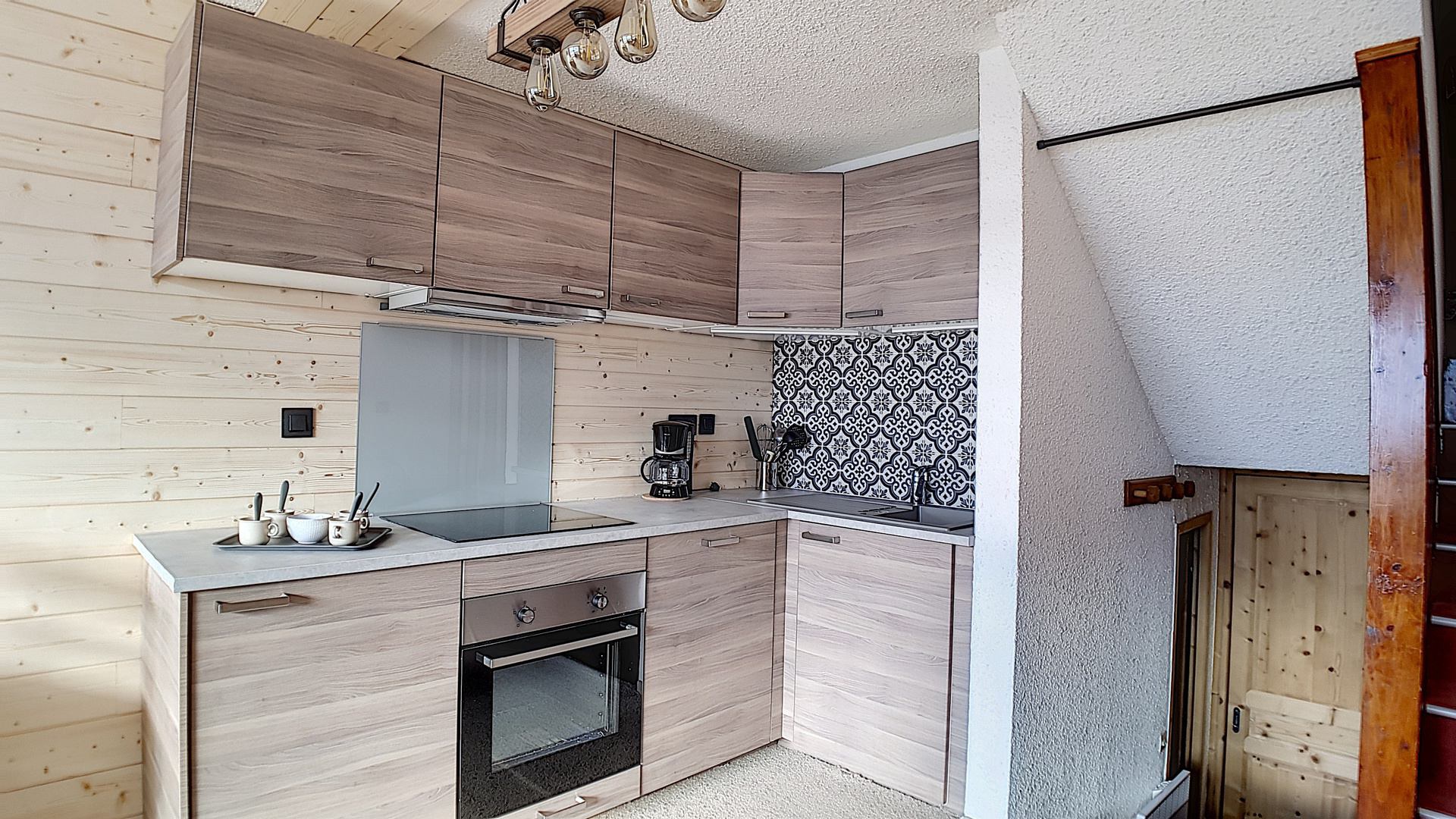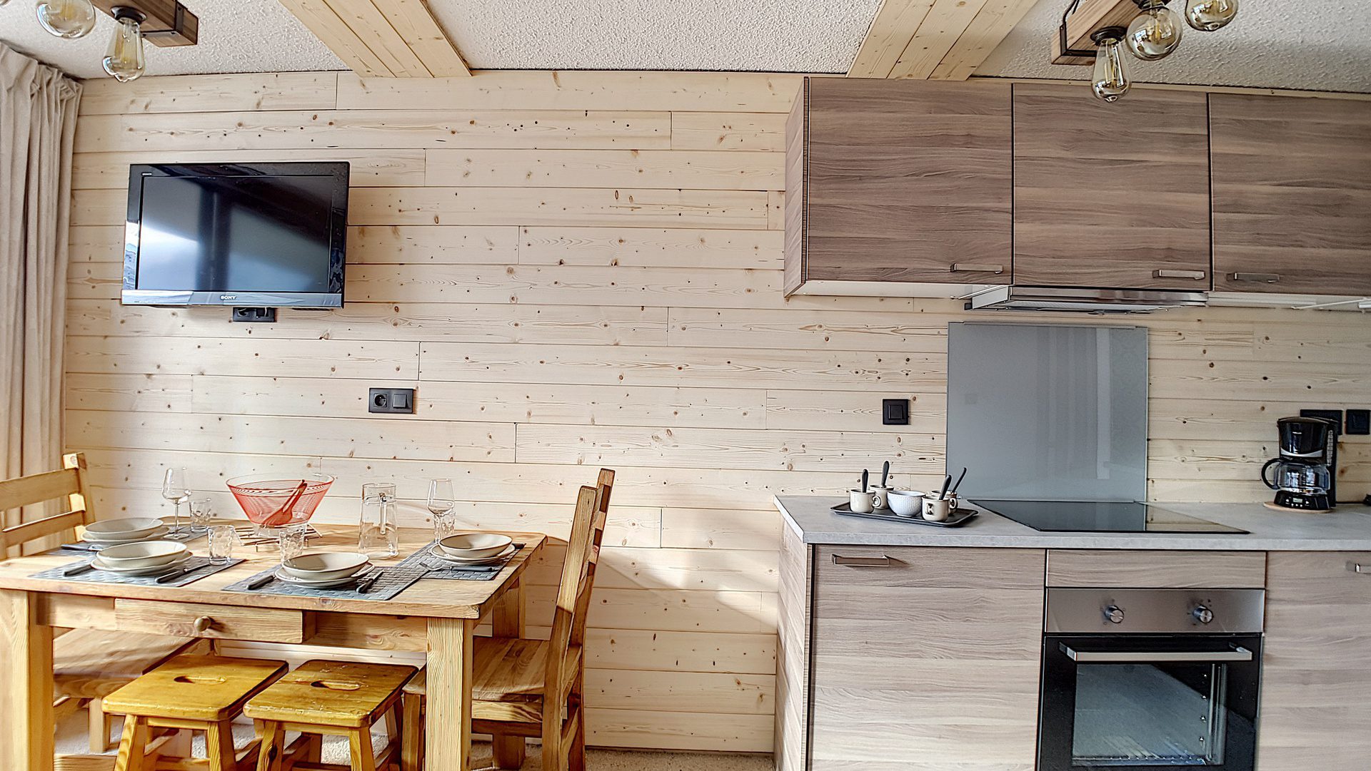 Cuisine incorporée 2 plaques vitrocéramiques, four, lave vaisselle, plaques inductions, four micro-ondes réfrigérateur, bouilloire, cafetière et grille-pain.