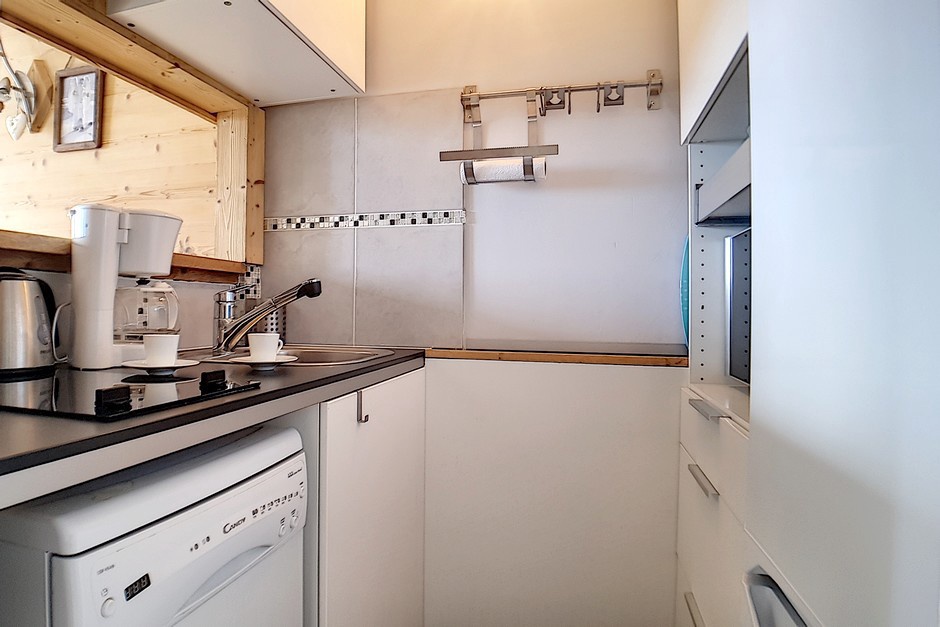 Cuisine équipée de 2 plaques électriques, micro-ondes grill, lave-vaisselle, réfrigérateur + compartiment congel, cafetière, grille-pain et bouilloire.