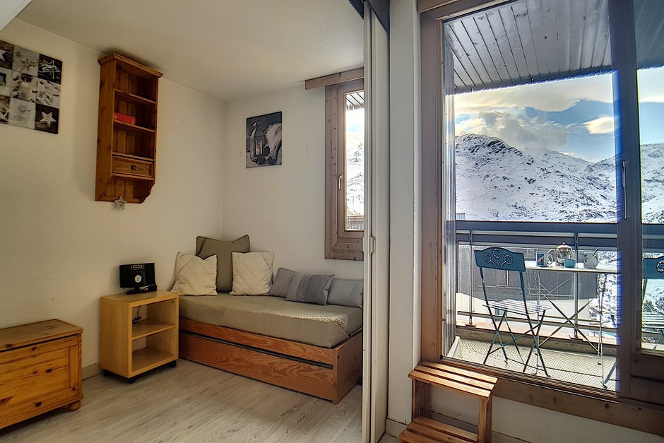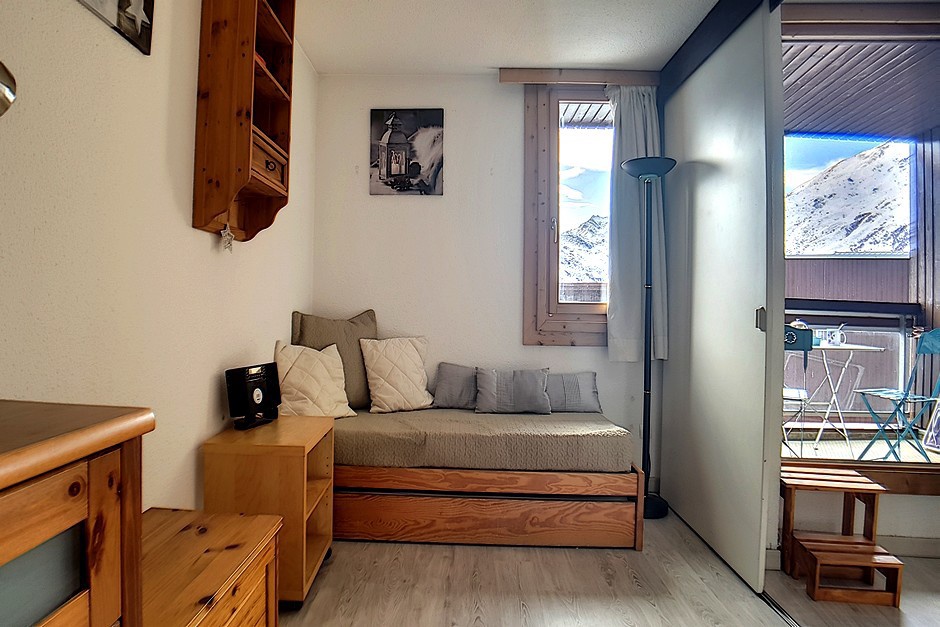 Chambre (séparée du séjour par cloison coulissante) : 1 banquette-lit 1 personne et 1 lit gigogne 1 personne. Equipée d'une télévision.