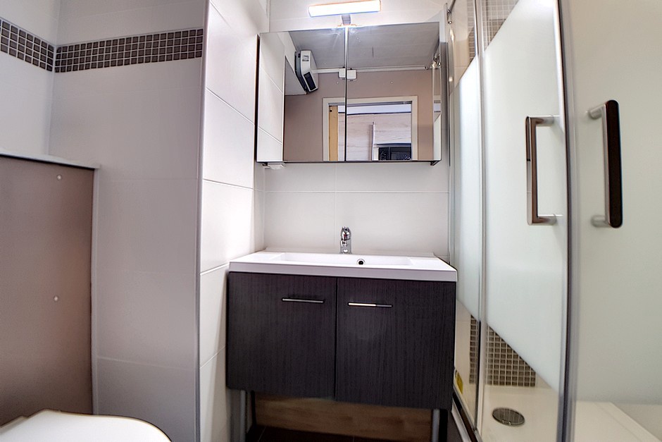 Salle de bain : avec cabine de douche, lavabo et toilette.