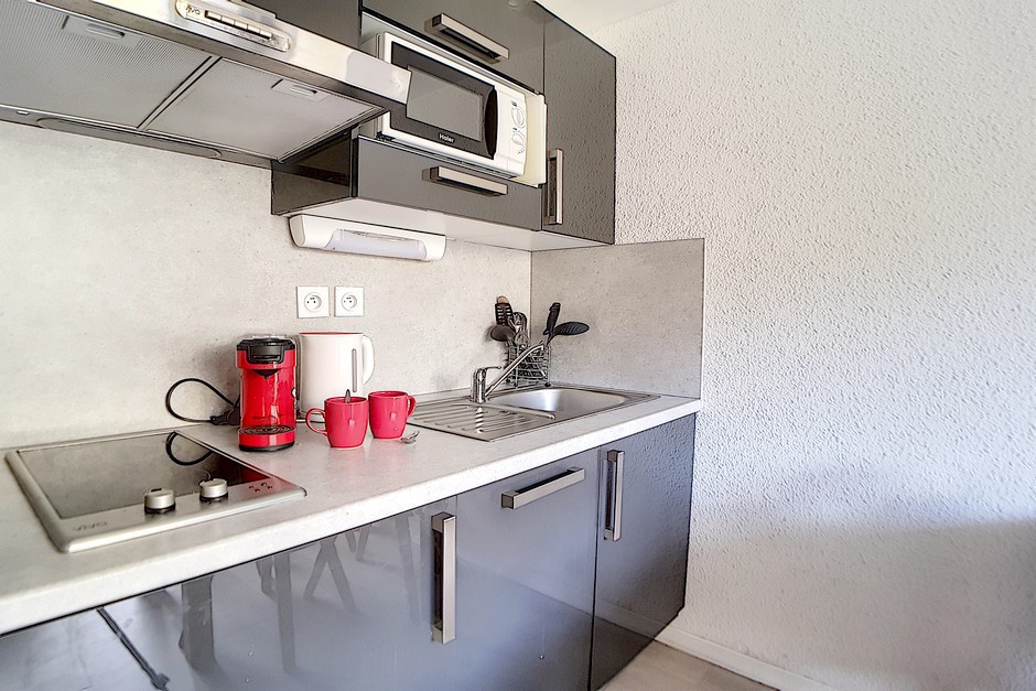 Cuisine incorporée 2 plaques, réfrigérateur, micro-ondes, lave-vaisselle, grille-pain, cafetière Senseo et bouilloire.