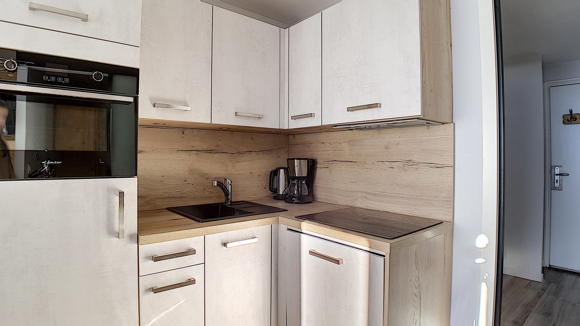Cuisine équipée de 3 plaques induction, frigo, micro-ondes combiné, lave-vaisselle, cafetière, grille-pain et bouilloire.
