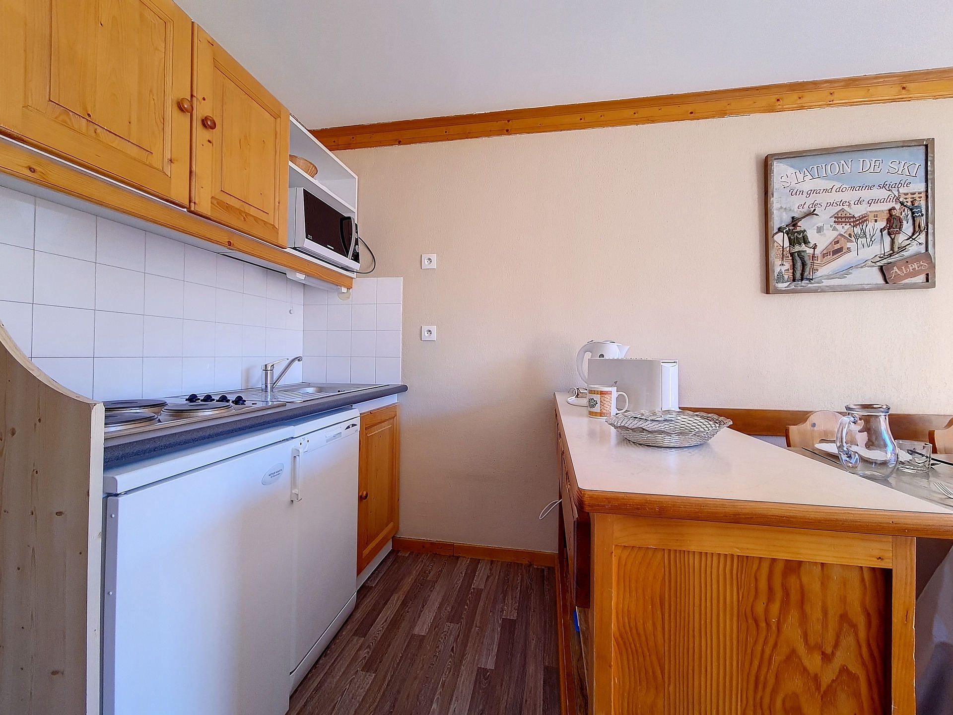 Cuisine équipée de 4 plaques électriques, micro-ondes, réfrigérateur, lave-vaisselle, bouilloire, cafetière et grille-pain.