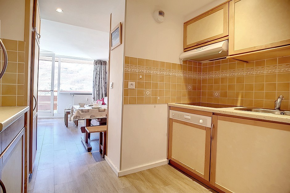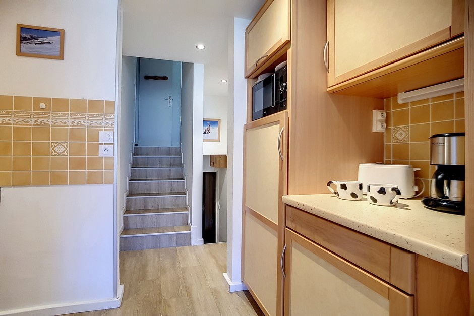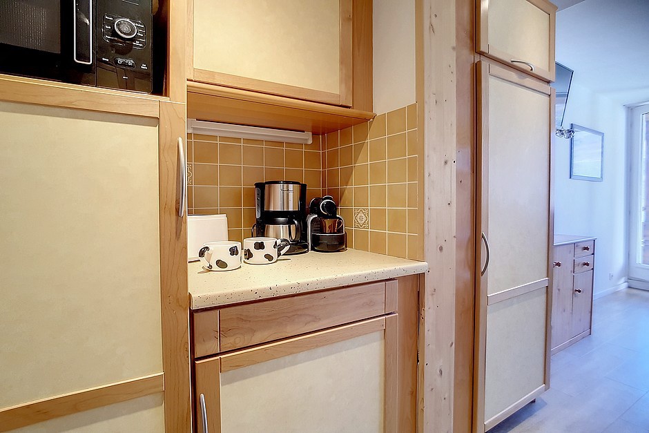 Cuisine incorporée 4 plaques vitrocéramique, grand réfrigérateur, lave-vaisselle, micro onde Grill, grille-pain, bouilloire et cafetière.