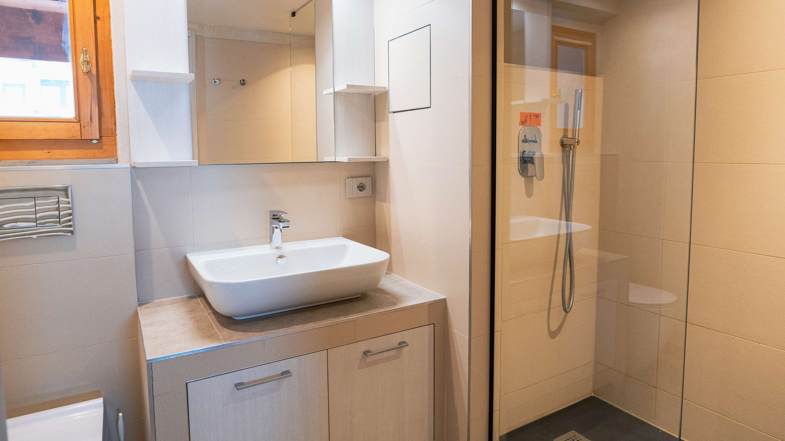 - Description: Salle d'eau équipée d'une douche, un toilette, d'un lavabo et d'un sèche serviette.