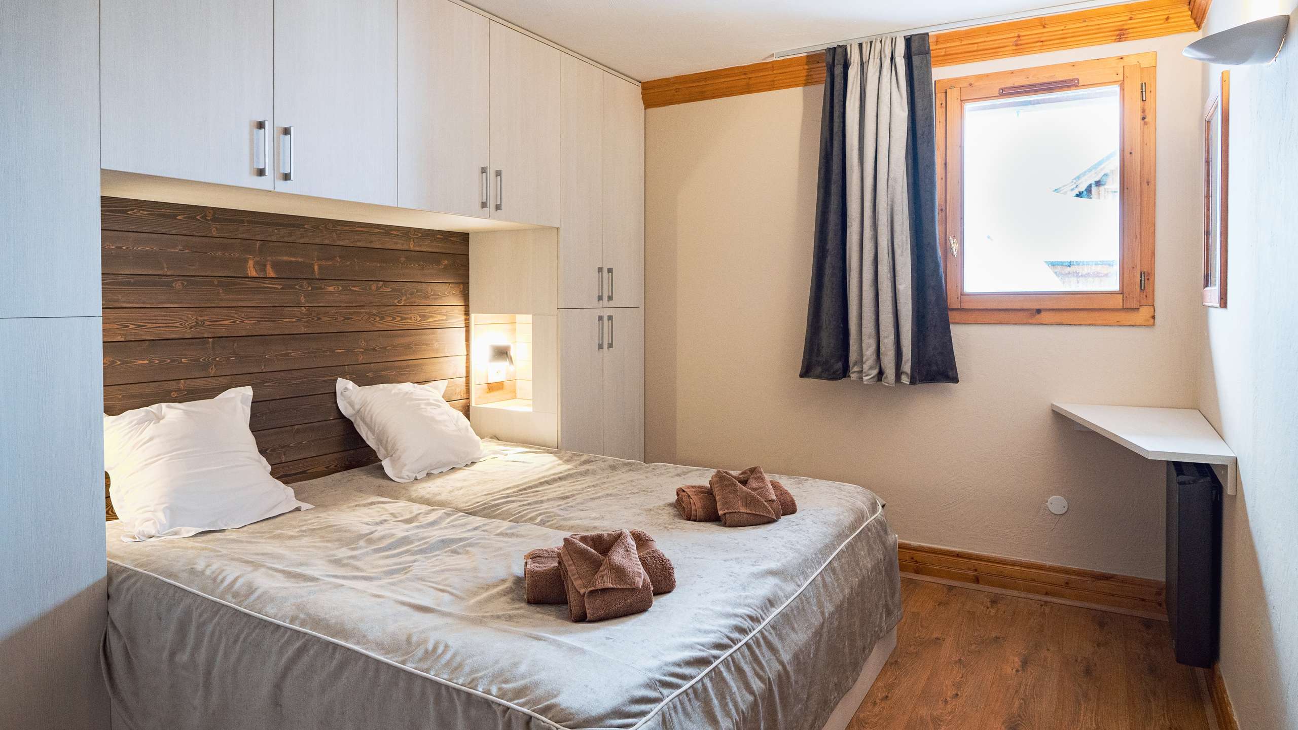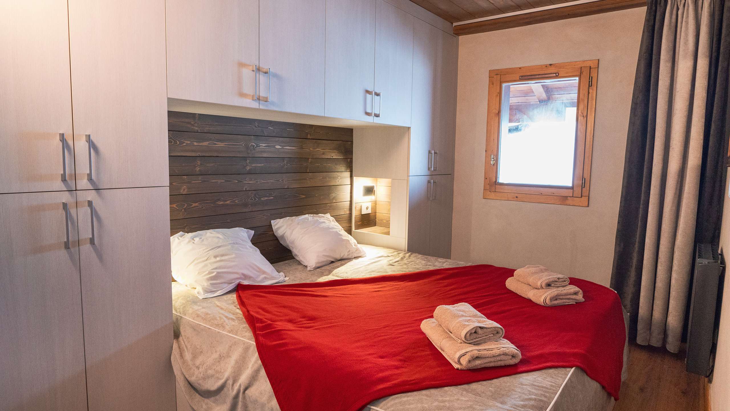 - Description: Chambre fermée par une porte avec 1 lits doubles (2 matelas de 90*190 cm), équipé de couettes et de d'oreillers carrés.