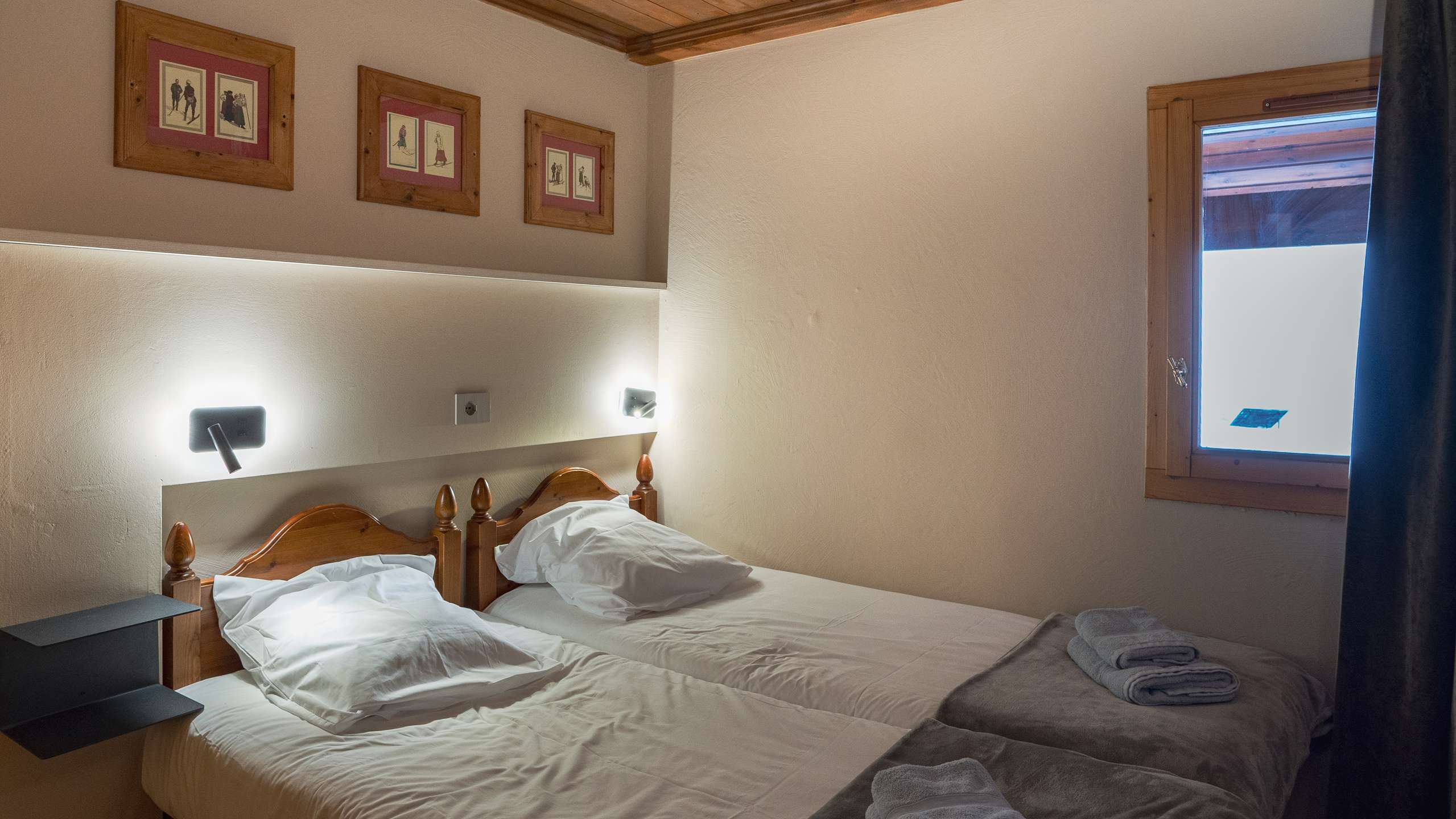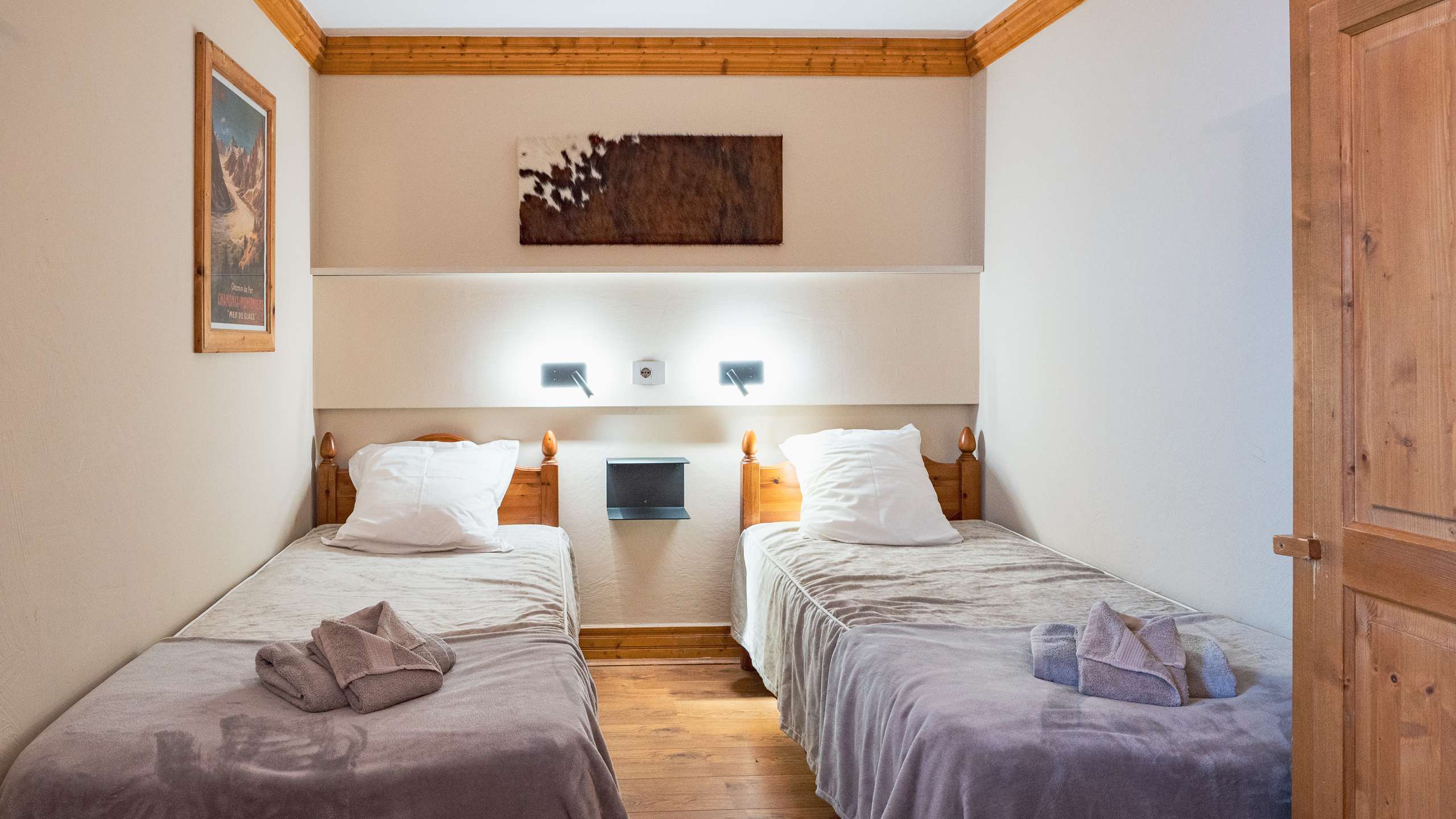 - Description: Chambre fermée par une porte avec deux lits simples, équipé de couette et d'oreillers carrés.
