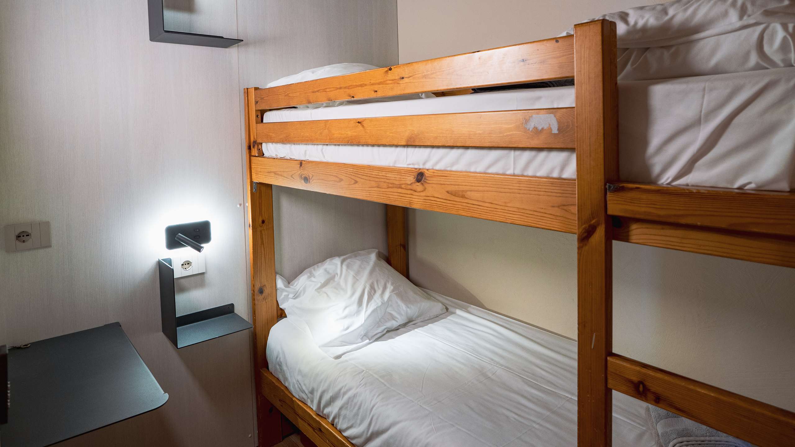 - Description: Chambre fermée par une porte avec 2 lits superposés (90*190 cm), équipé de couettes et d'oreillers carrés.
