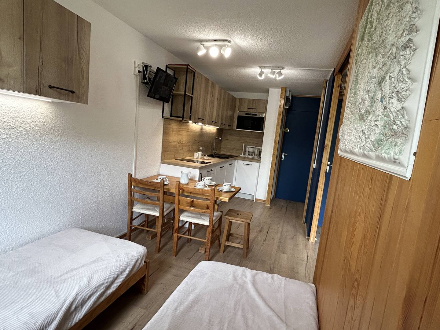 Studio divisible comprenant deux lits simples dans la partie repas et deux lits simples dans la partie nuit. Télévision. Dimensions des lits : 80x190. Cuisine ouverte (rénovée en été 2024) équipée de plaques électriques, lave vaisselle, micro ondes, grille-pain, bouilloire, cafetière et réfrigérateur. Salle de bains, WC séparés. Balcon orienté Sud-Est. Casier à ski dans la résidence. Ascenseur. Etage -3. Appartement non-fumeur.