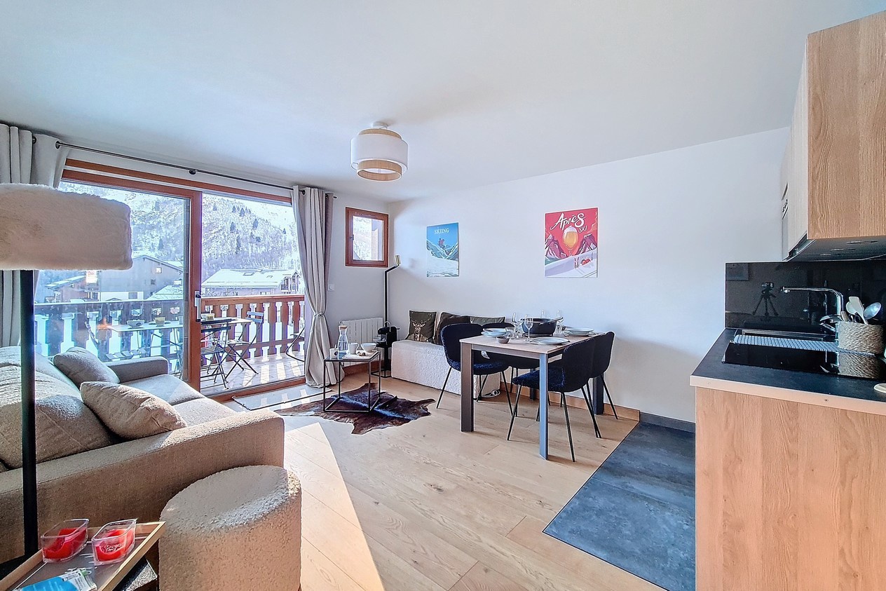 Séjour agréable sans Télévision et accès direct au balcon donnant sur le front de neige.