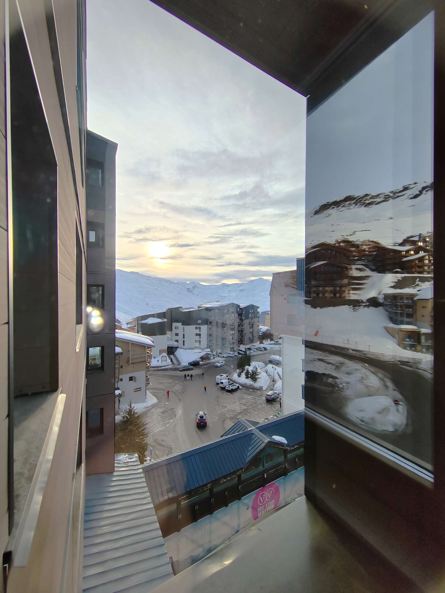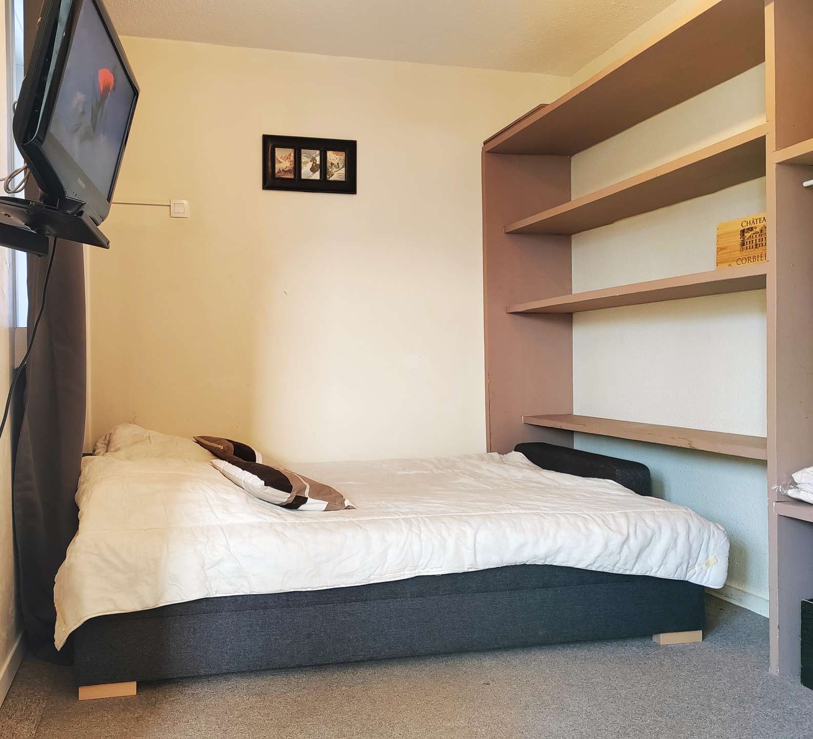 - Description: grand espace avec vue sur les montagnes, un canapé lit confortable et de qualité, télévision et grand rangement