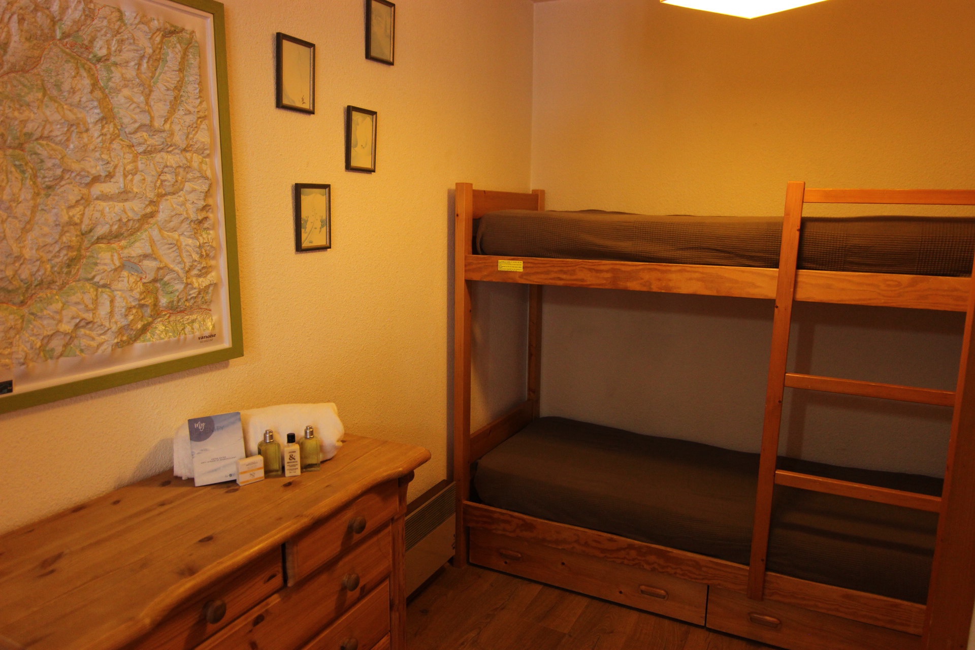 Cabine : lits superposés séparés du séjour par un rideau.