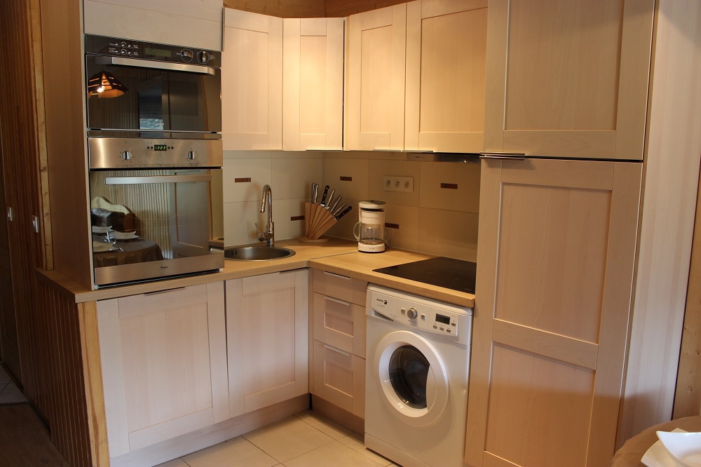 Cuisine: four, micro-ondes, plaques vitrocéramiques, réfrigérateur, lave-vaisselle, hotte et lave-linge.