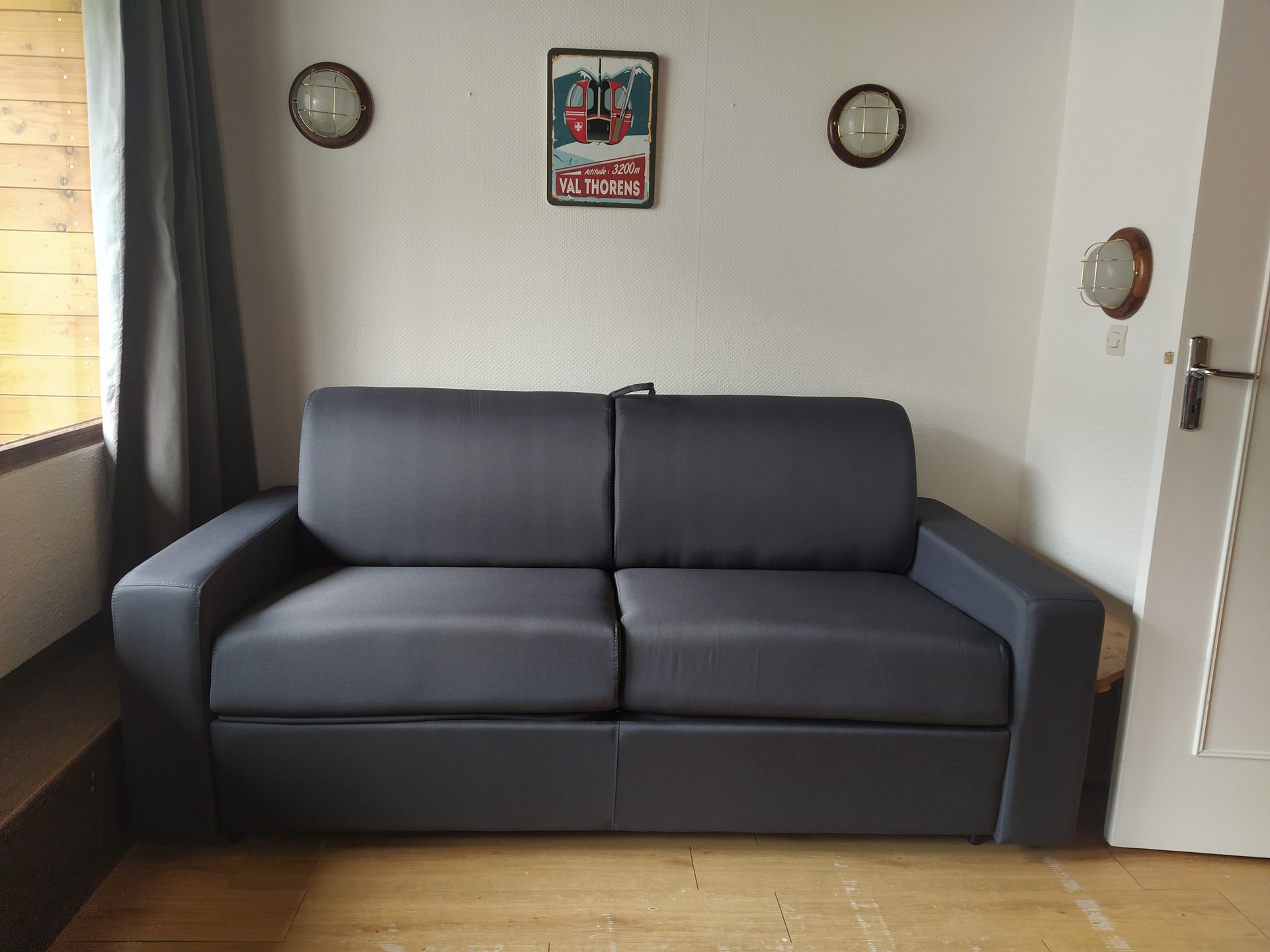 Séjour: télévision, banquette gigogne (convertible en deux lits simples côte à côte).