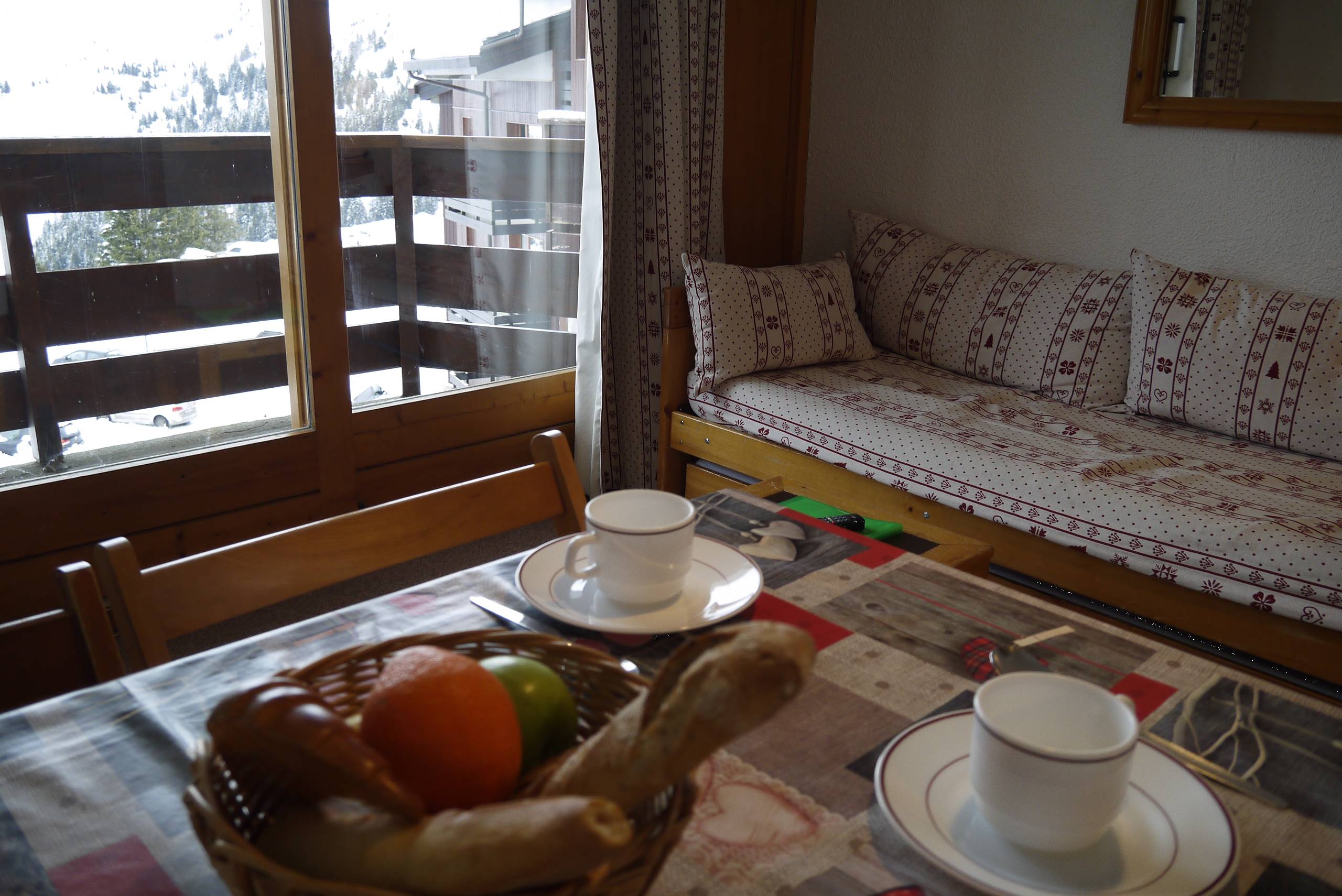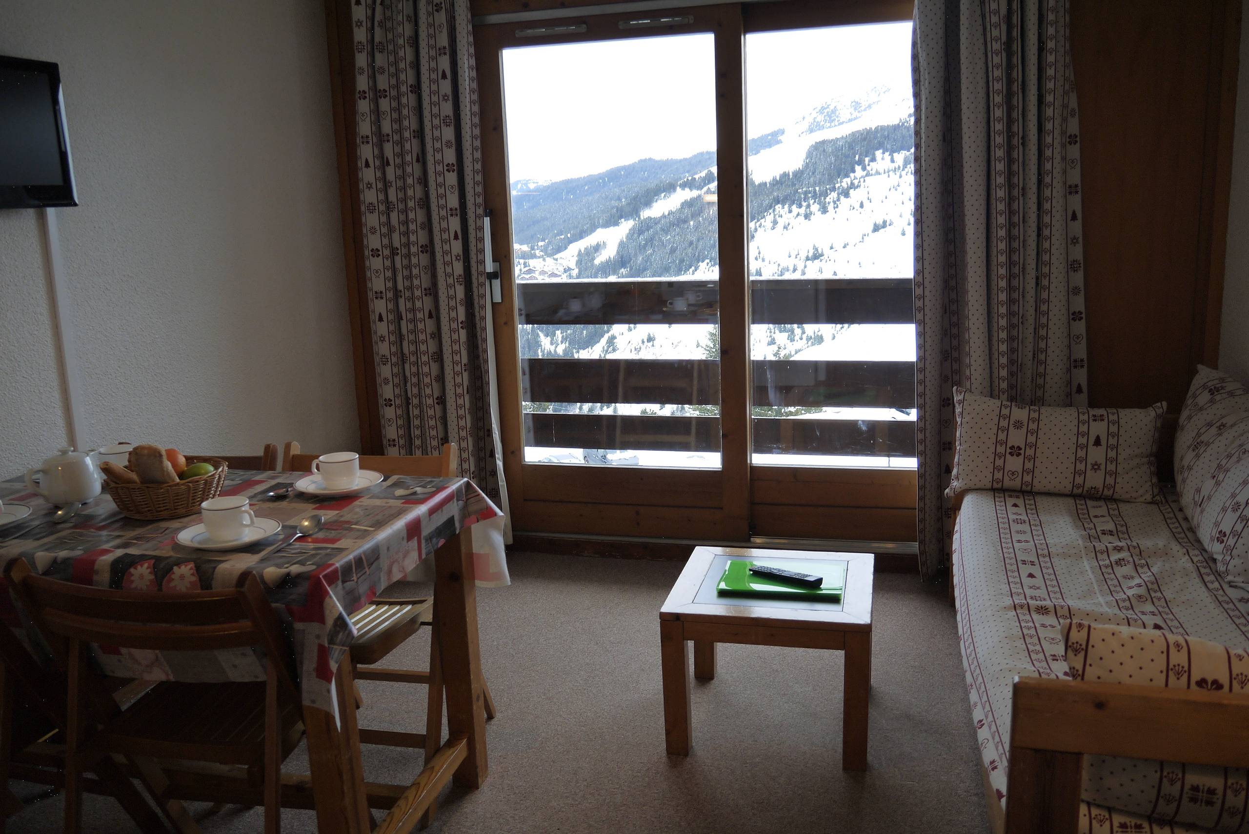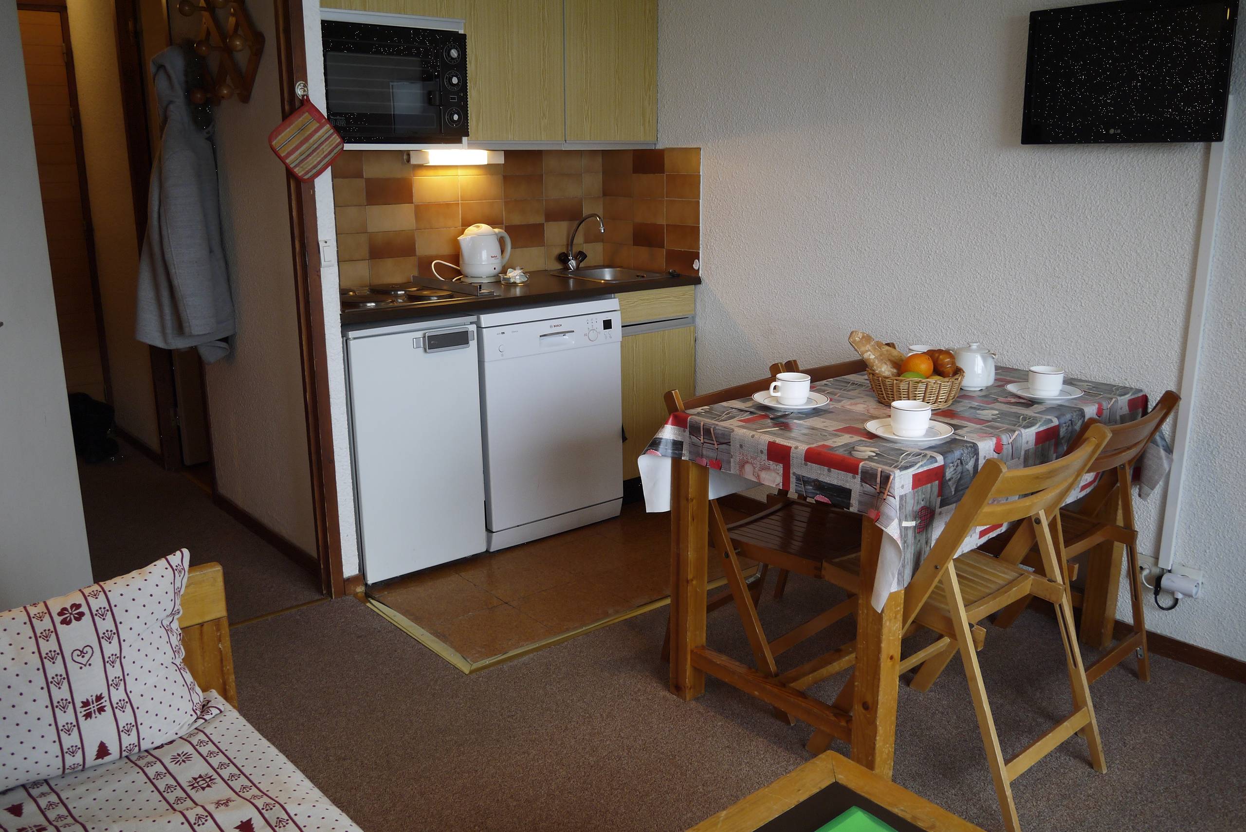 Hall d'entrée contenant un ensemble de lit superposés (80x190). Dans le séjour se trouve une banquette lit et un lit gigogne (80x190), la télévision. Kitchenette équipée de plaques électriques, four, lave vaisselle, réfrigérateur. Salle de bains avec wc. Exposition Nord-Est. Balcon, casier à skis et ascenseur dans la résidence. Appartement non-fumeur / Animaux non admis.
