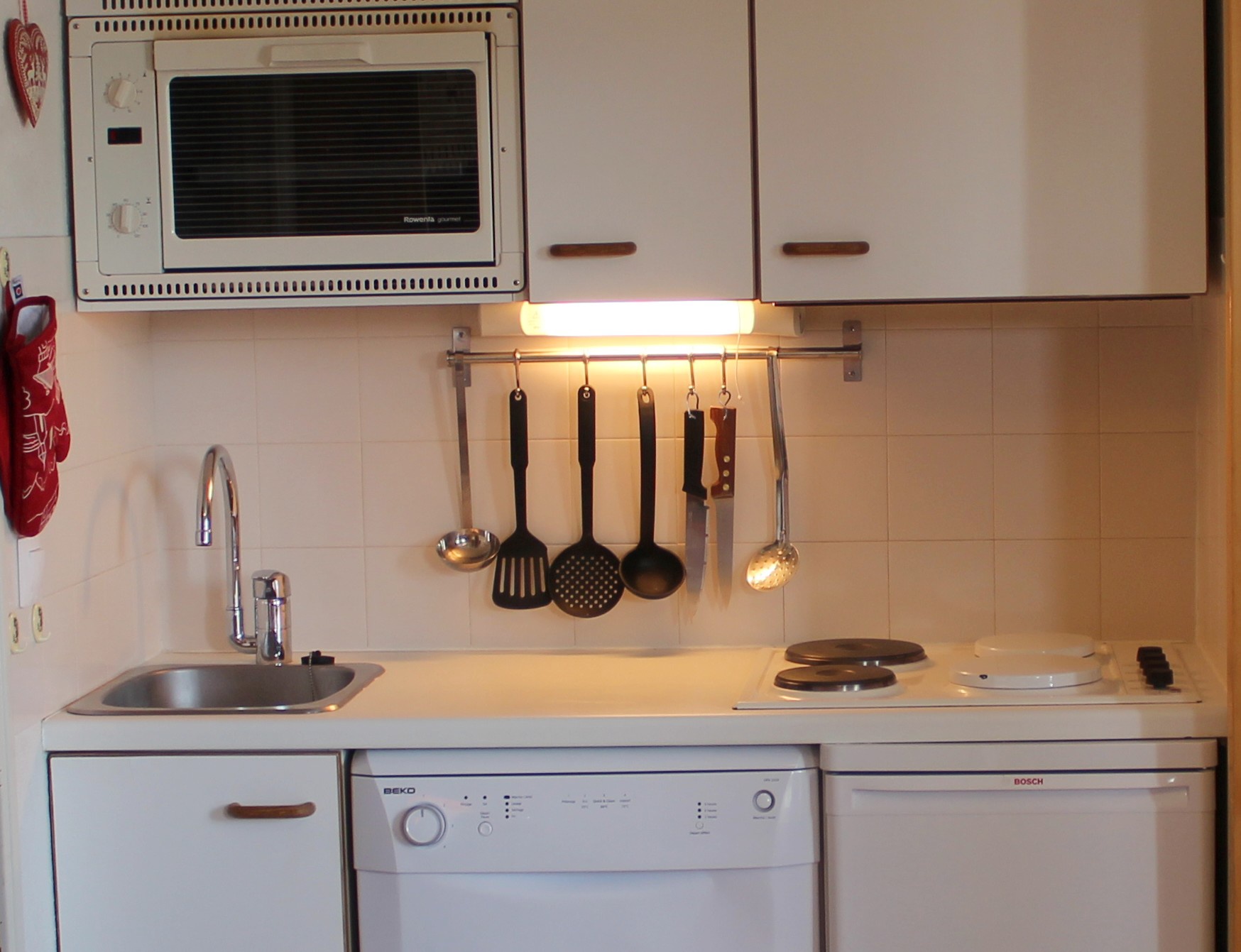 Coin cuisine: four, micro-ondes, plaques électriques, réfrigérateur, lave-vaisselle, hotte.