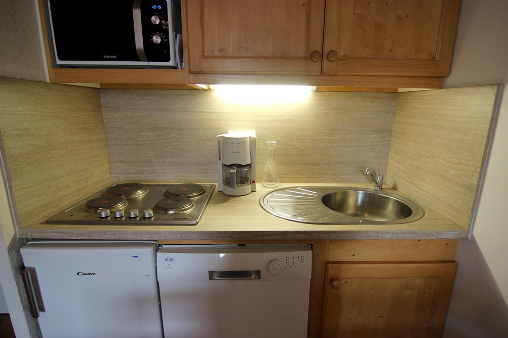 Coin cuisine: micro-ondes, plaques électriques, réfrigérateur et lave-vaisselle.