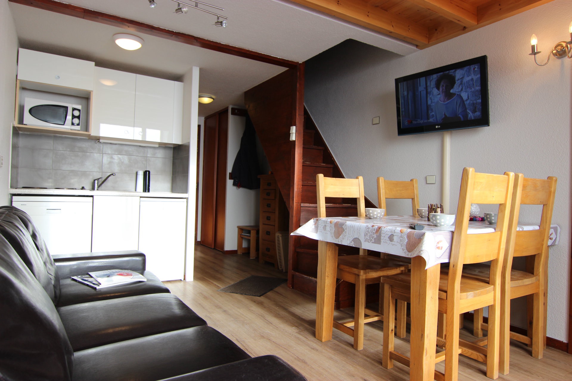 Séjour: télévision, canapé, coin repas.