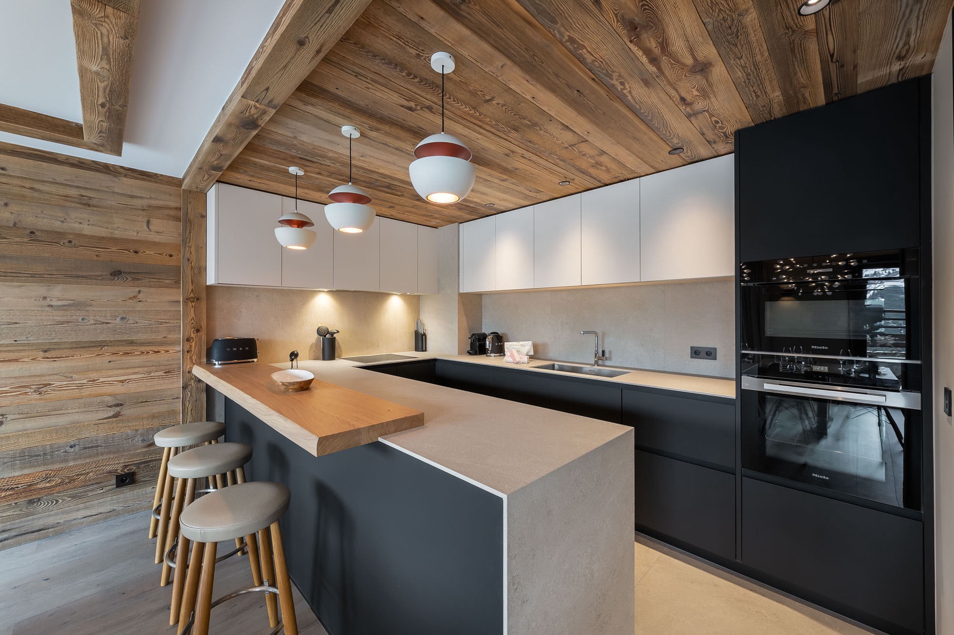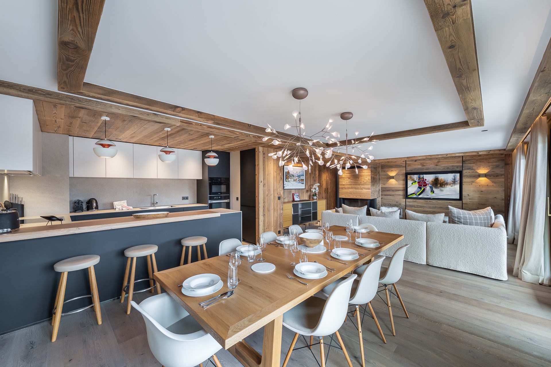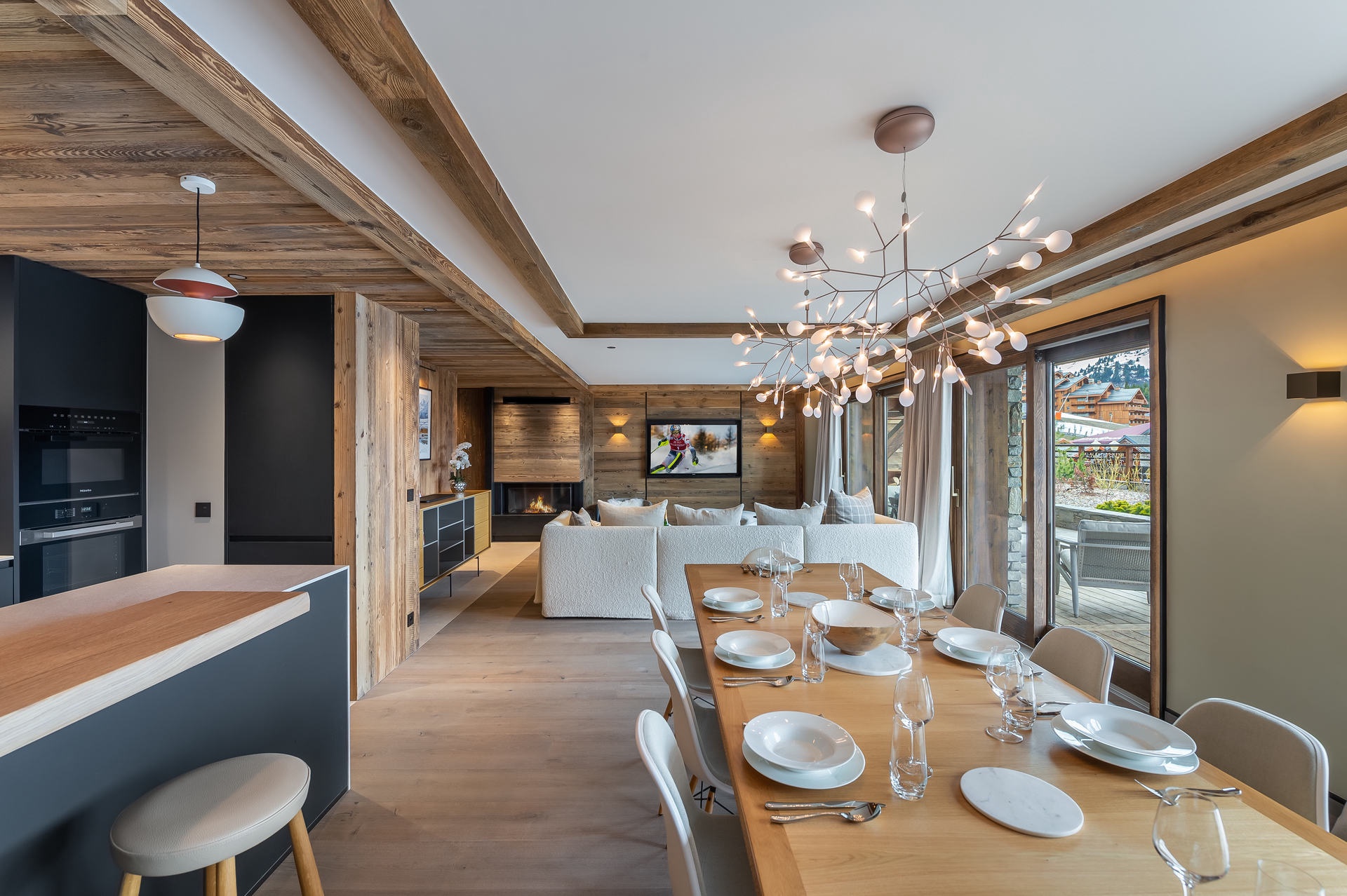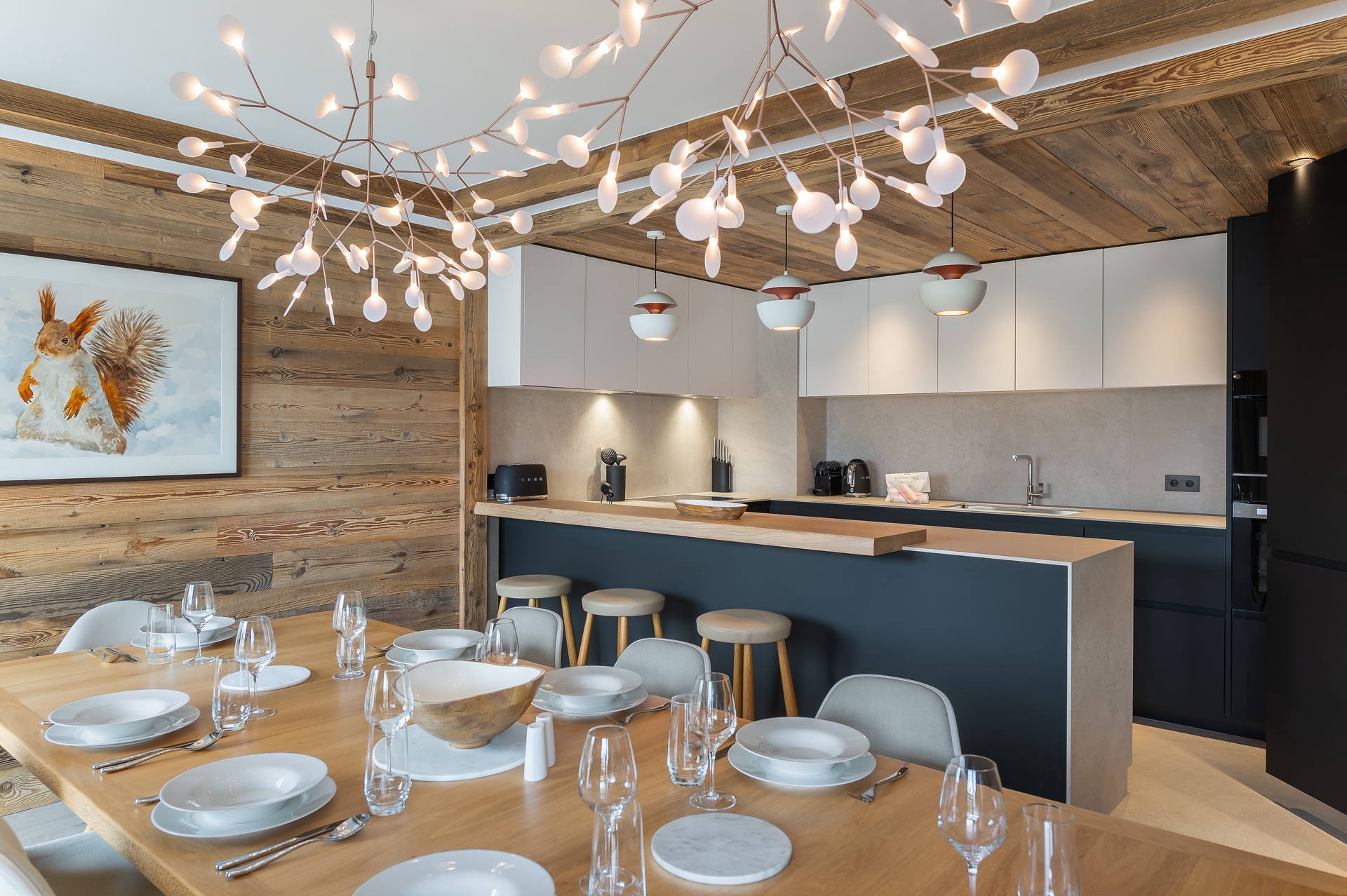 - Cuisine ouverte équipée : réfrigérateur, four, four micro-onde, lave-vaisselle, plaques induction, hotte, bouilloire, service à fondue, Nespresso, grille-pain, appareil à raclette, mixeur