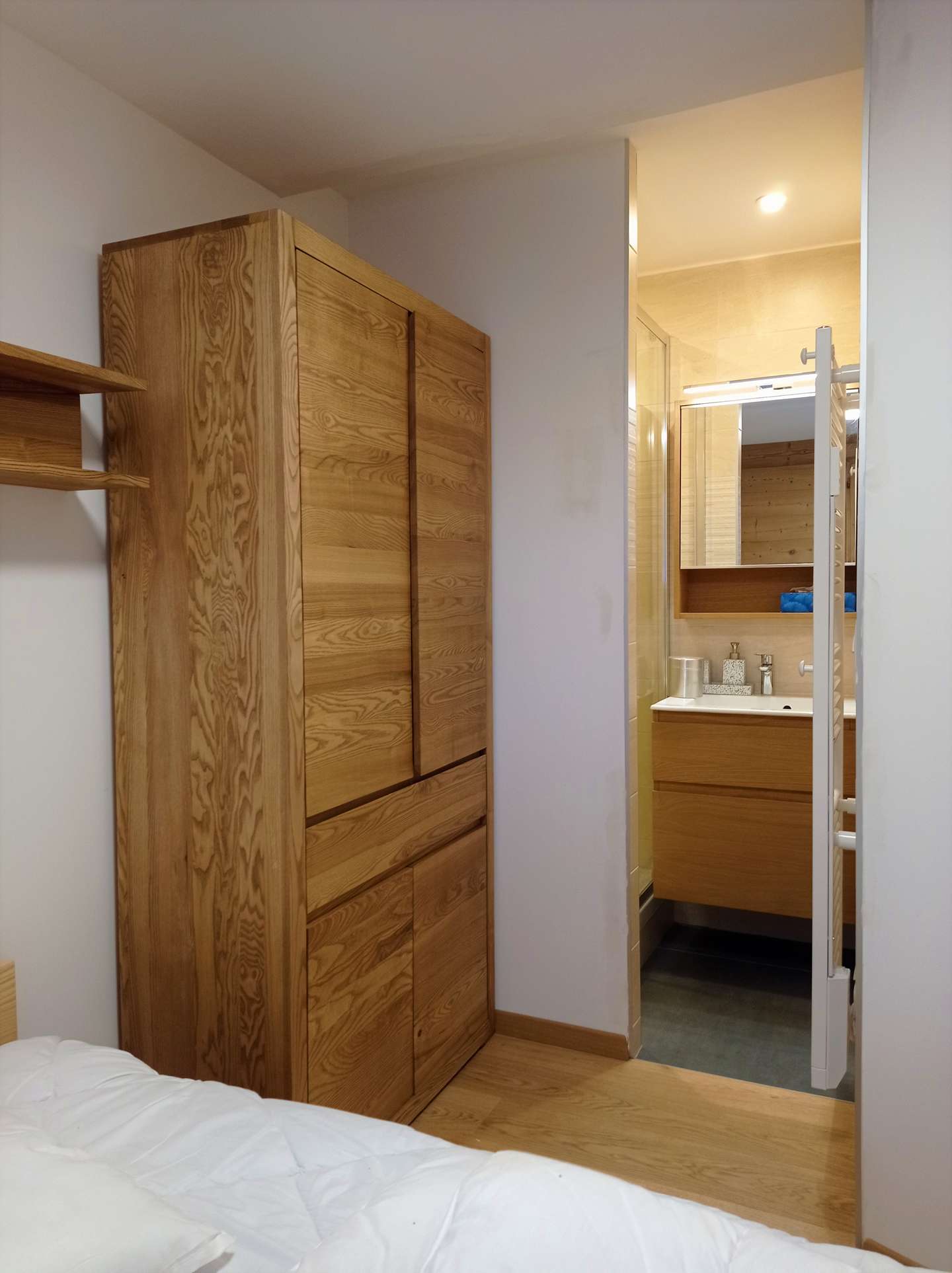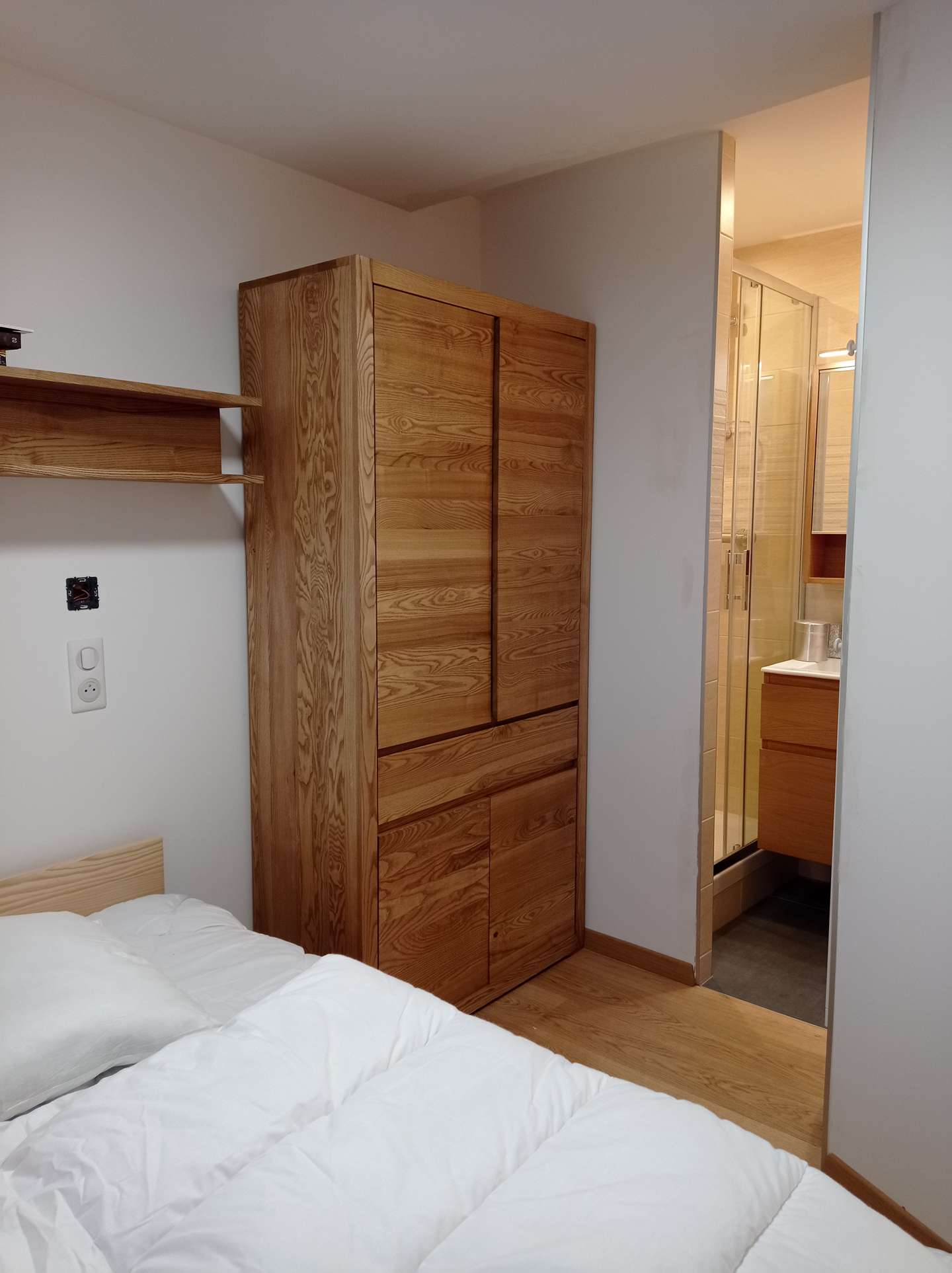 - RDC : 1 chambre équipée avec un lit queen size, une salle d’eau avec douche et lavabo sur meuble, sèche-serviettes et rangements,