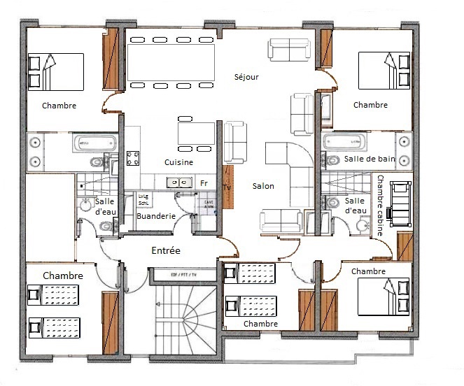 Ce spacieux appartment de 140m² pouvant accueillir jusqu'à 10 convives se trouve au coeur de la station et à moins de 2 minutes des pistes, au niveau 4 d'une résidence sans ascenseur (l'entrée se trouvant au niveau 5).