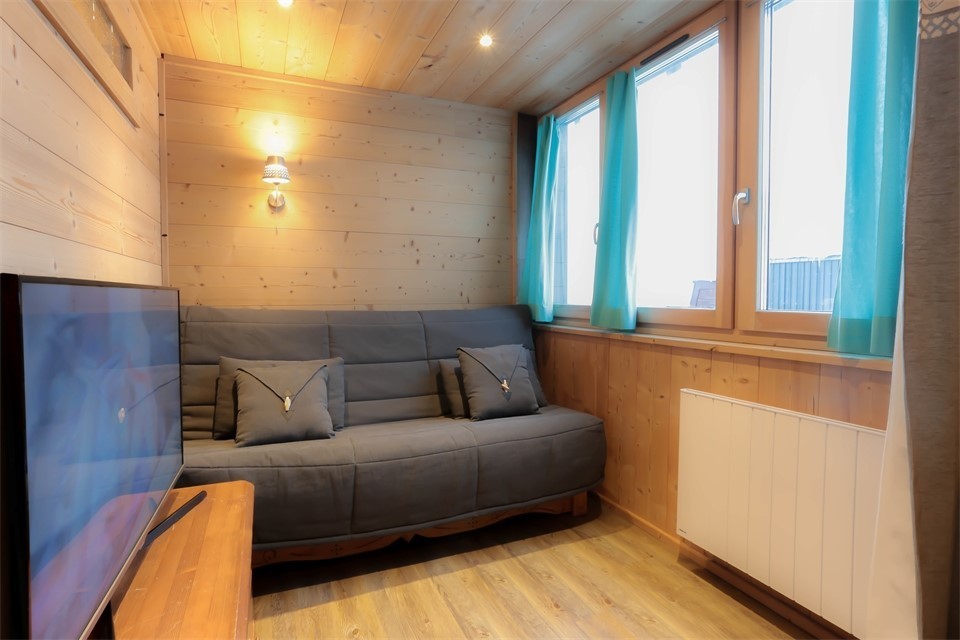 - Séjour équipé d’un canapé convertible et d’une TV.