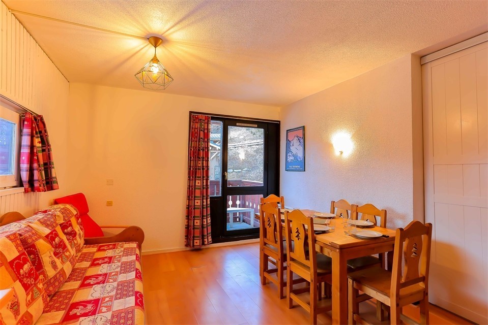 - Séjour équipé d’une banquette gigogne (soit 2 couchages), d’une TV avec lecteur DVD et d'un coin repas avec 5 places assises.