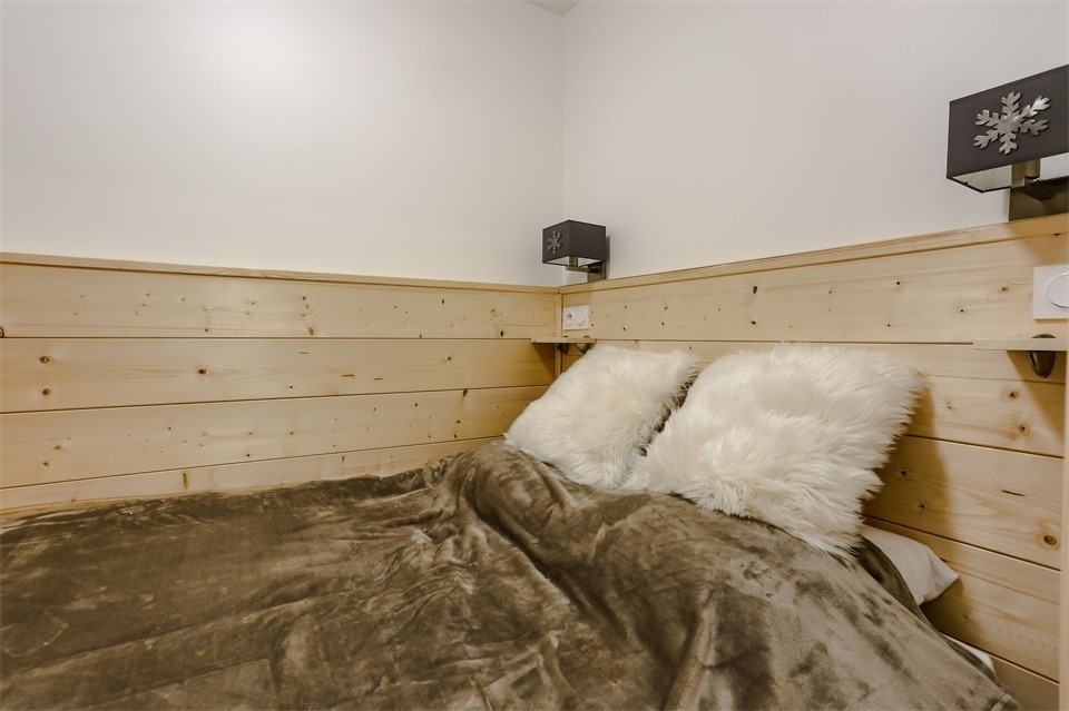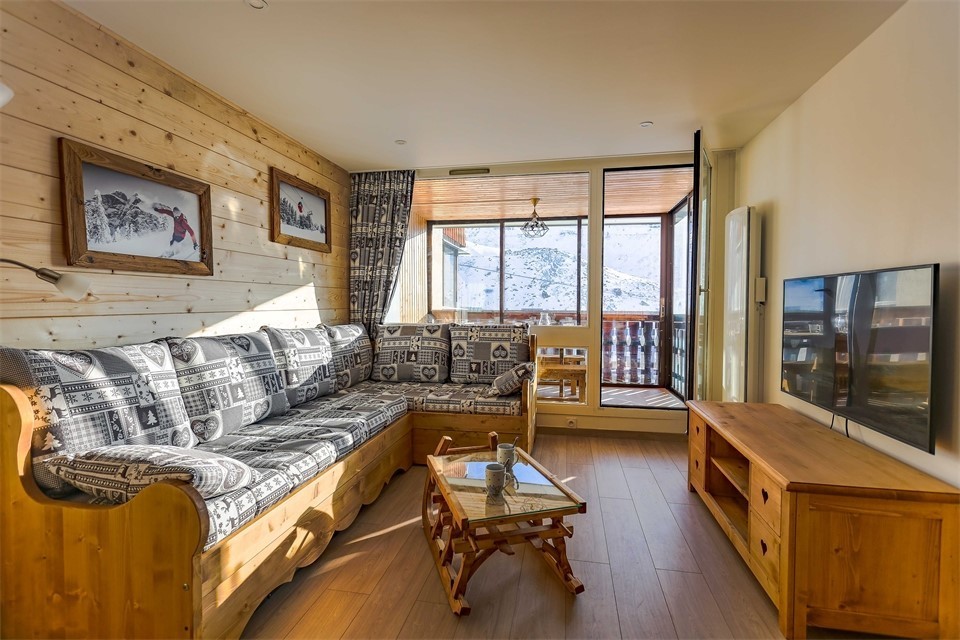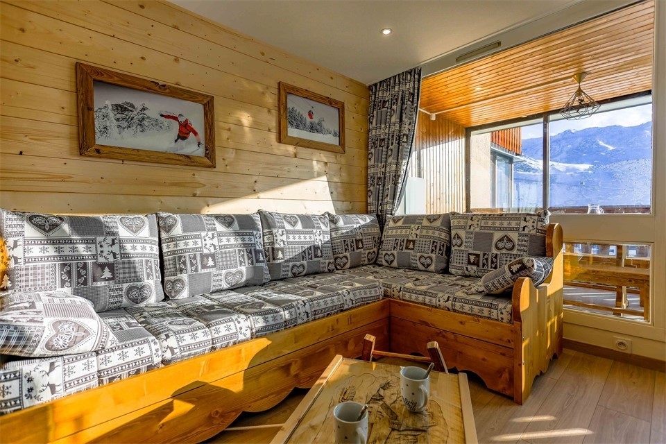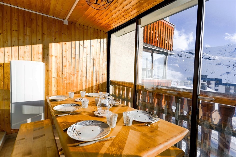 Appartement entièrement rénové automne 2019, style montagne avec des boiseries de 34 m² + 7 m² de véranda pour 6 personnes au 4ème étage avec ascenseur. Vue Plein Sud sur les cimes de Val Thorens.