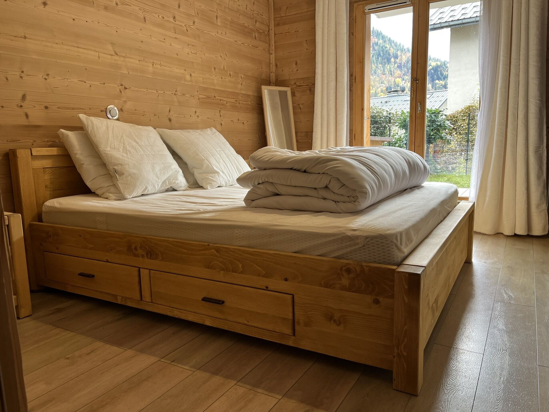 Chambre avec lit double (160×200 cm) et un grand placard avec penderie.