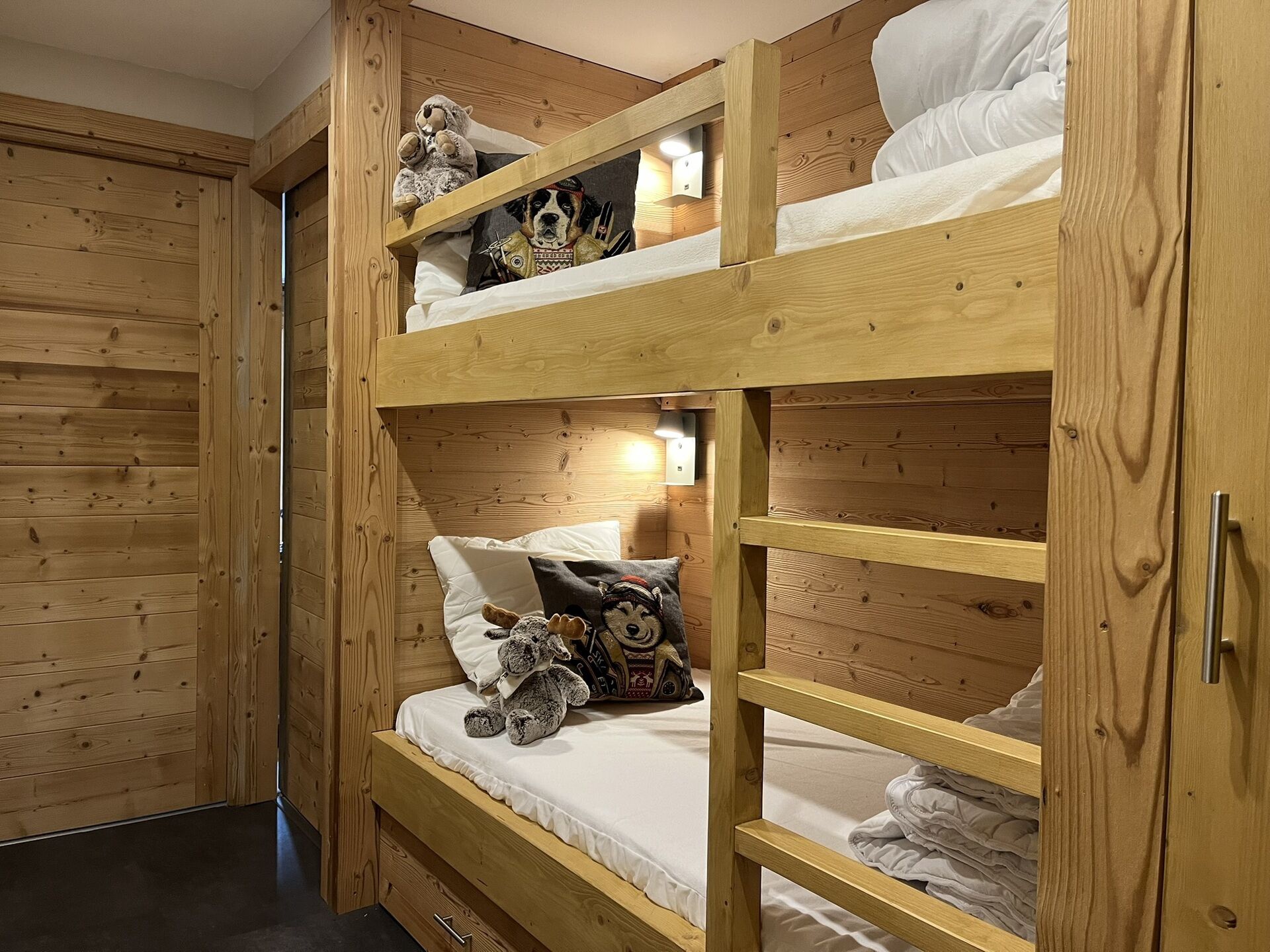 Coin montagne avec 2 lits superposés (90×190 cm) et des placards.