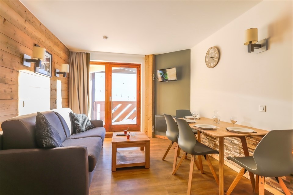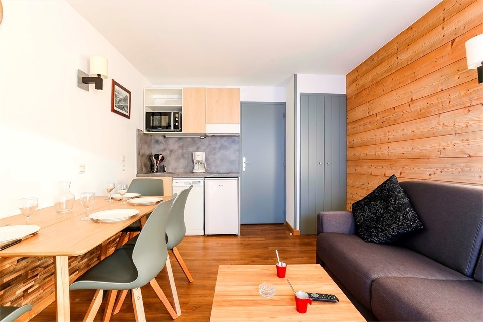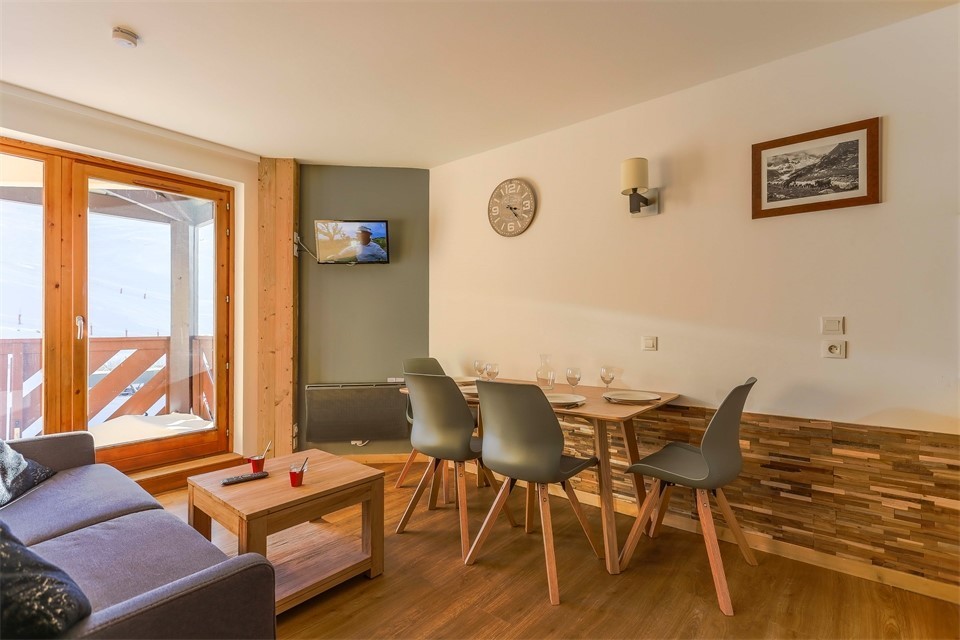 Appartement rénové de 27m² pour 4 personnes au 5ème étage d'une résidence avec ascenseur. Balcon exposé Sud-Est avec vue sur les pistes et la montagne, équipé d'une table et de 2 chaises.