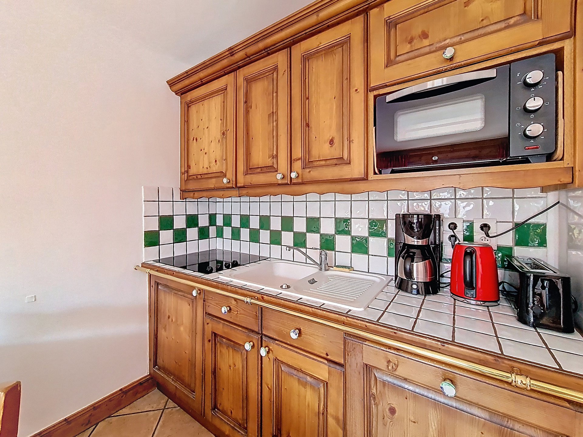 Cuisine américaine équipée de 4 plaques vitrocéramiques, hotte, grand réfrigérateur et un petit réfrigérateur, micro onde, mini four, lave-vaisselle, cafetière, grille pain, bouilloire.