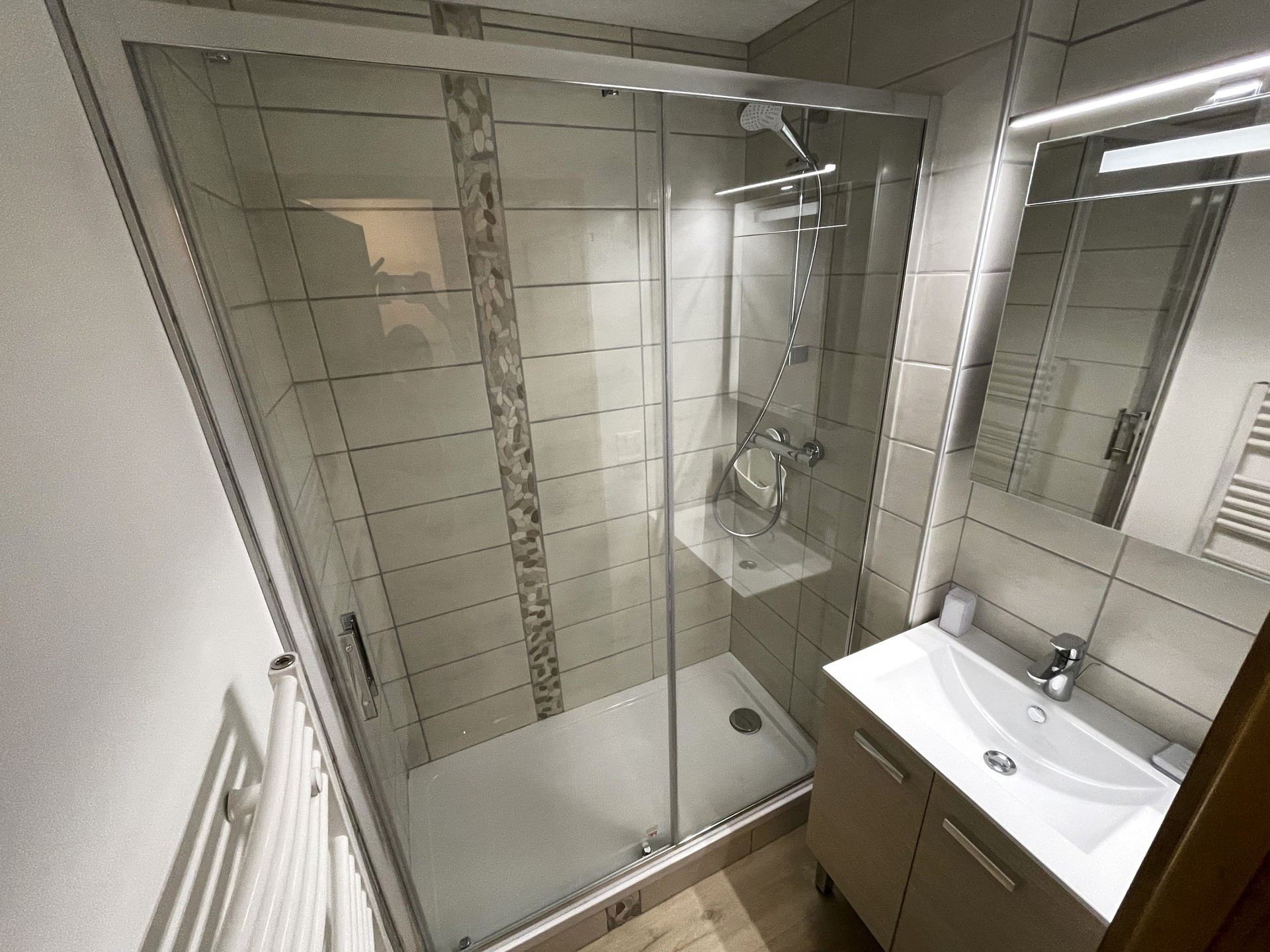 Salle de bains : lavabo, douche, sèche-serviettes, sèche-cheveux