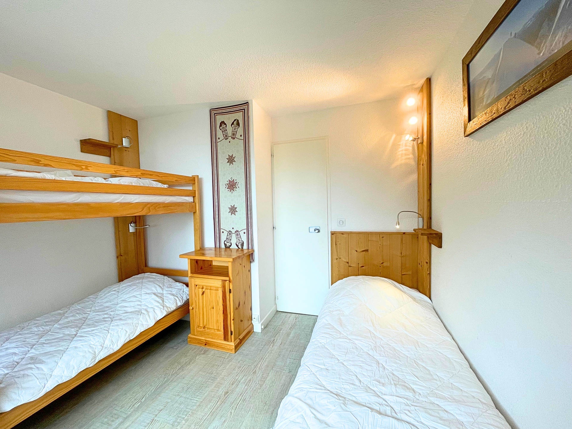 Chambre : lit simple superposé (2x80 cm), lit simple (1x80 cm), petit balcon exposé Nord