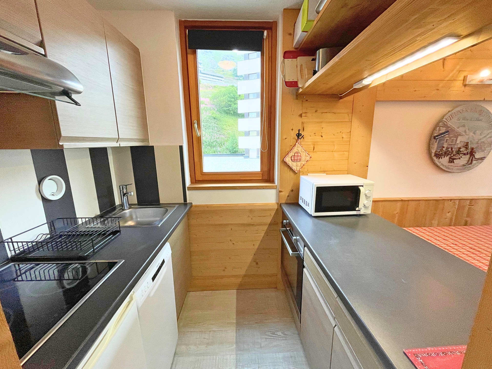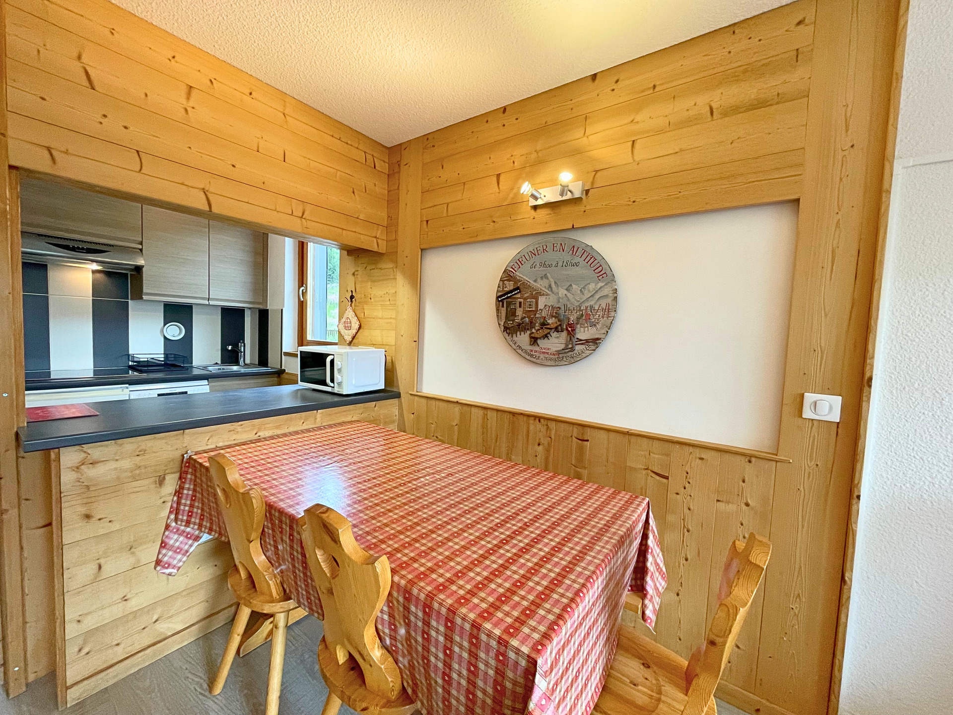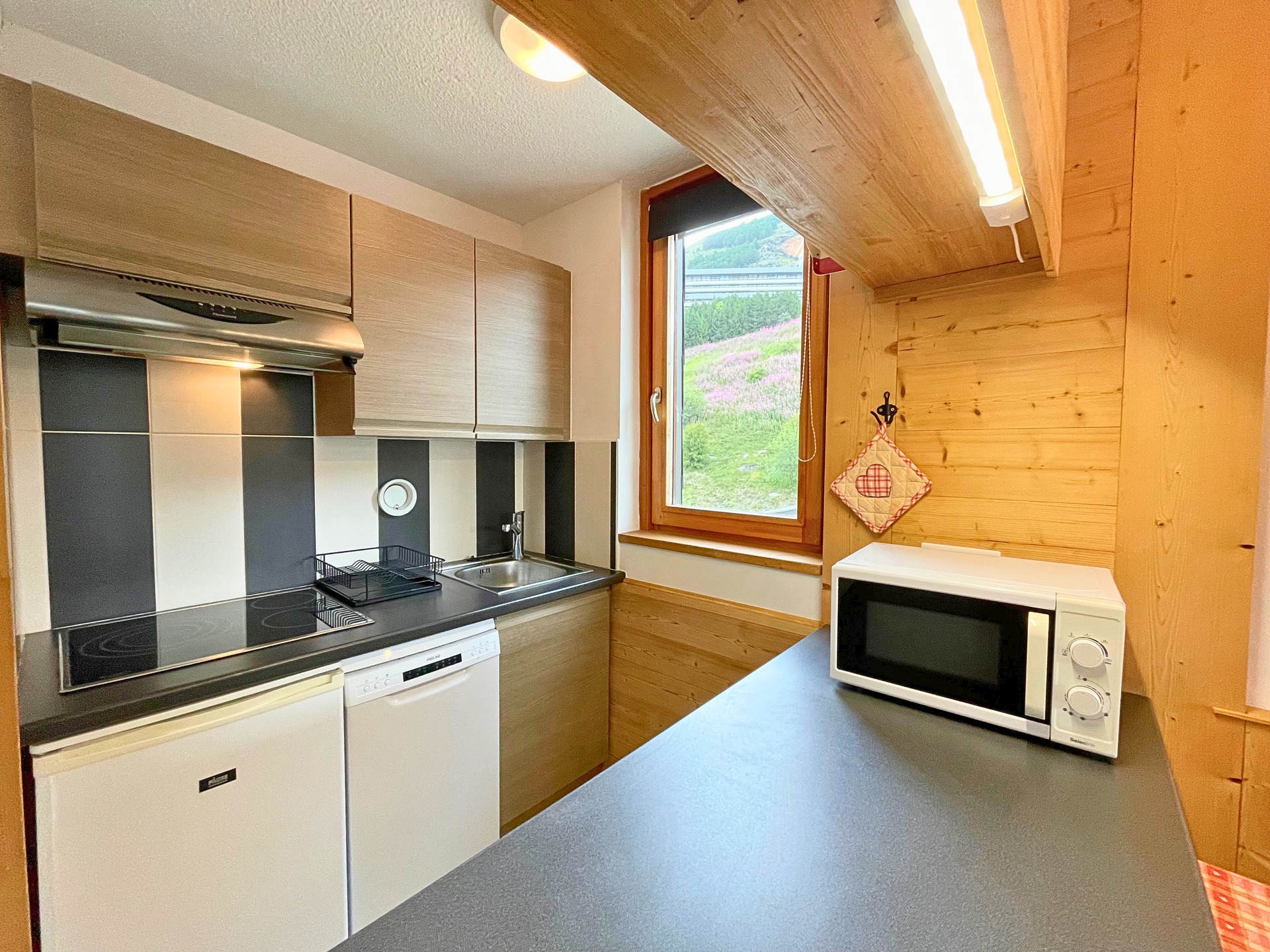 Cuisine ouverte sur le séjour : plaques de cuisson vitrocéramiques (x3), hotte, four, micro-ondes, réfrigérateur (congèle 10L), lave-vaisselle, cafetière à dosette Senseo, bouilloire, grille-pain, appareil à raclette
