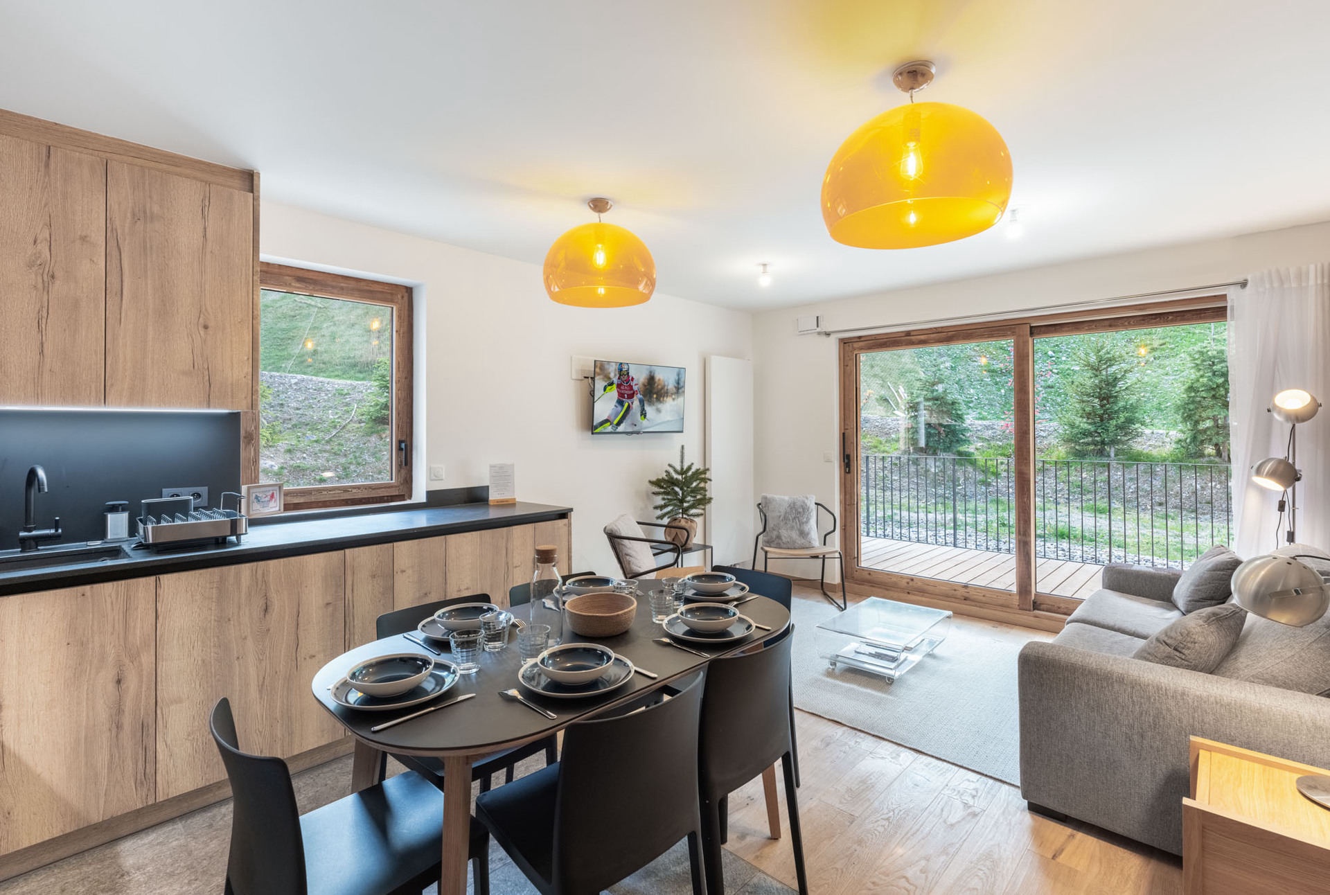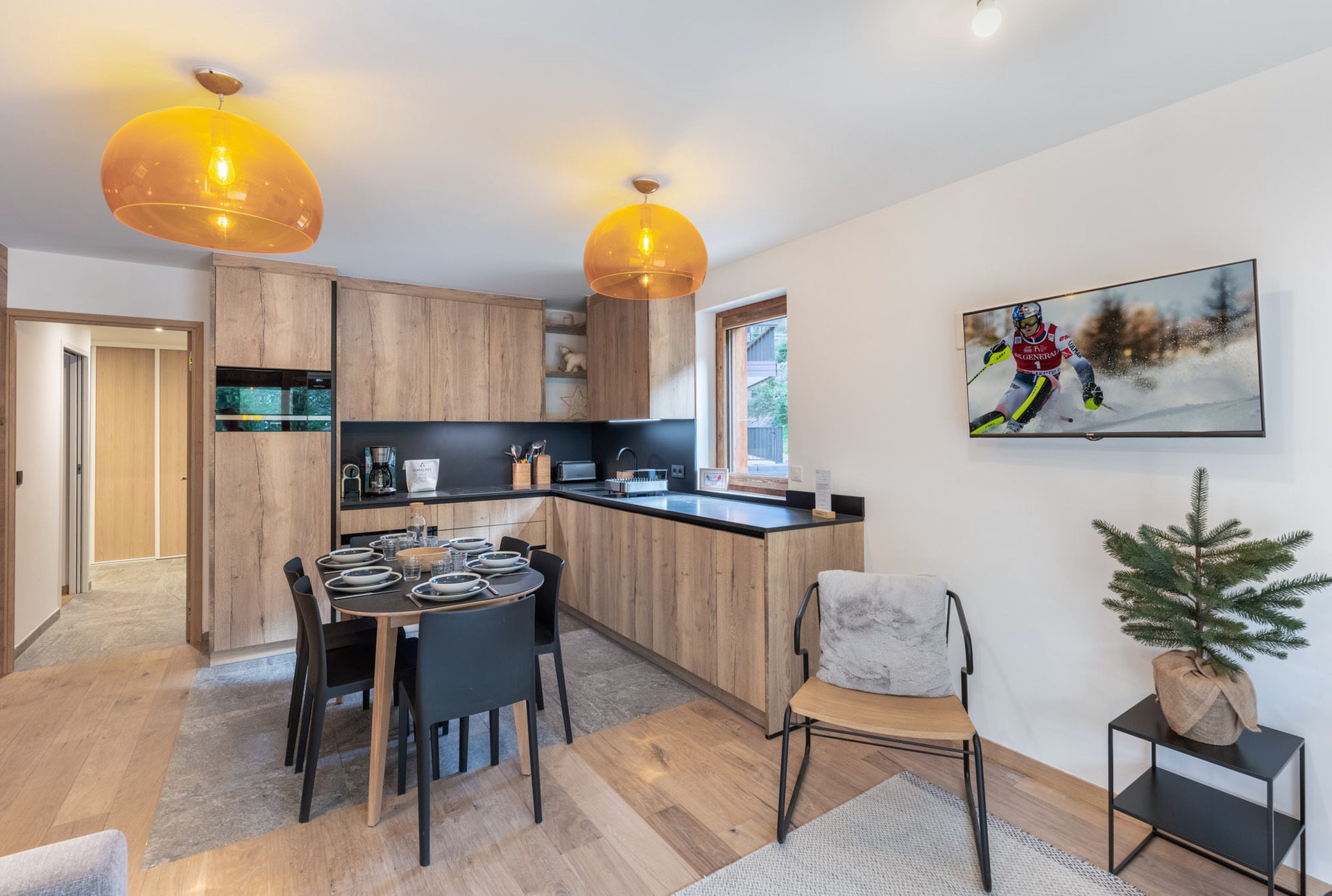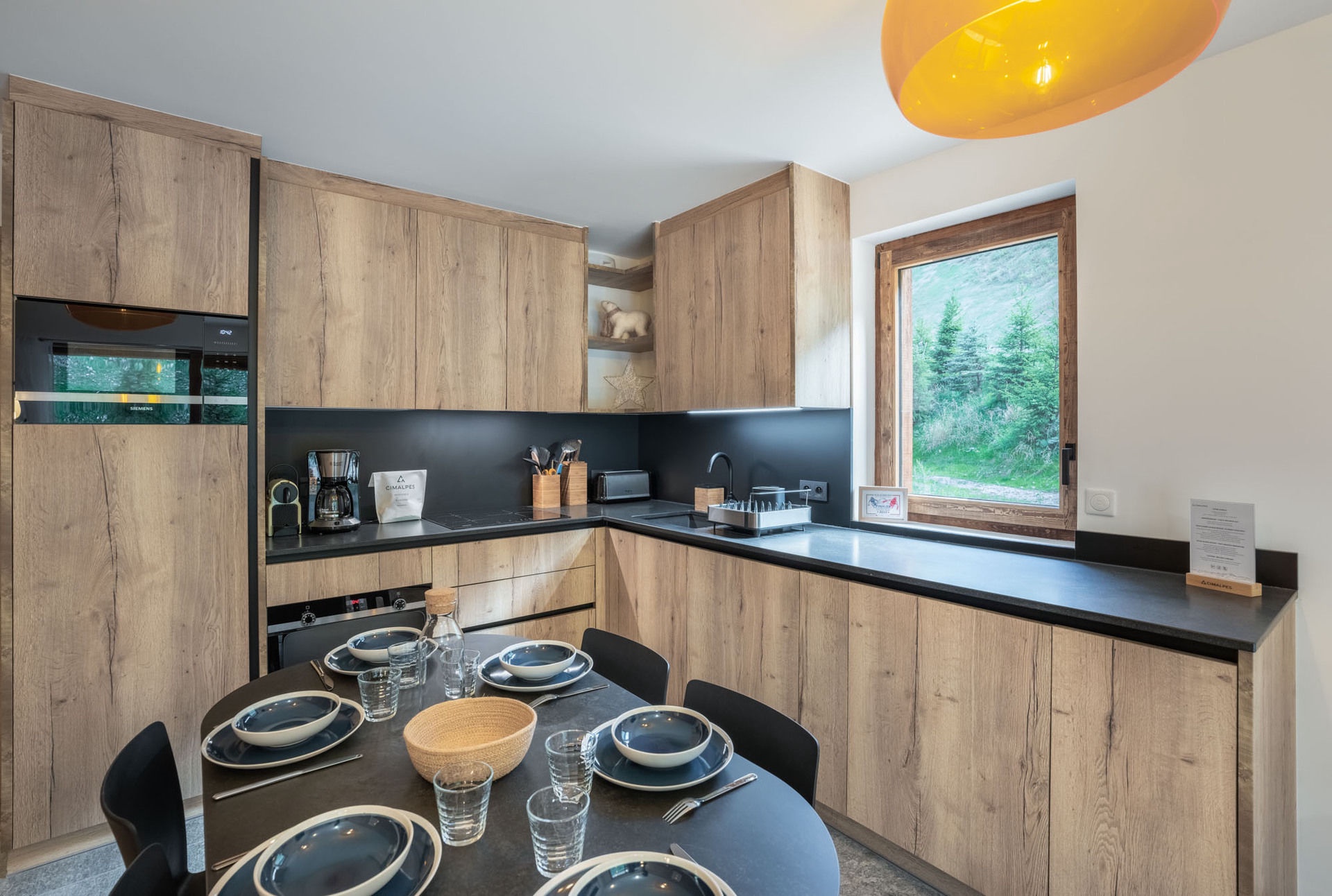 - Cuisine ouverte équipée (lave-vaisselle, plaques à induction, micro-onde, four...)