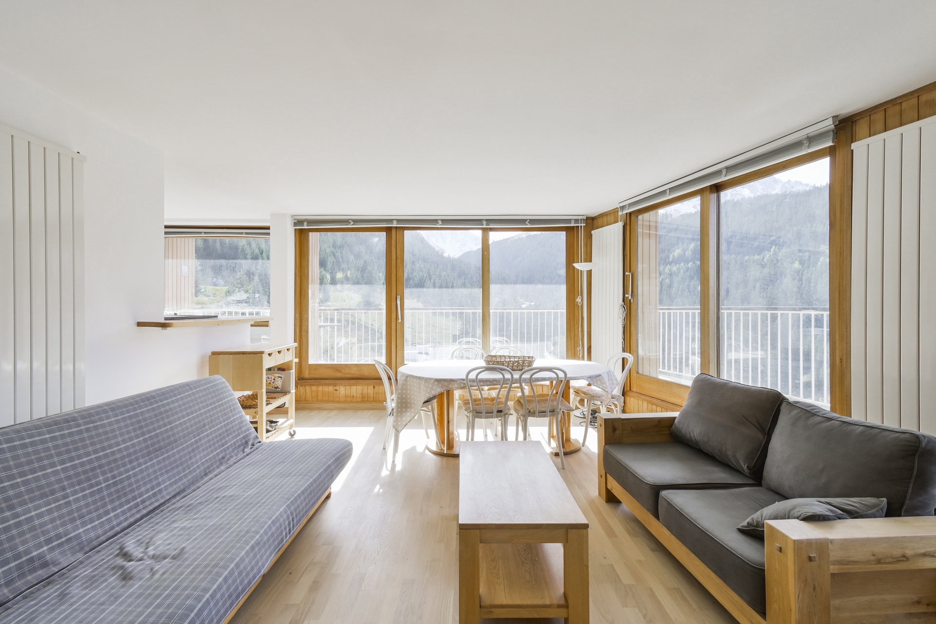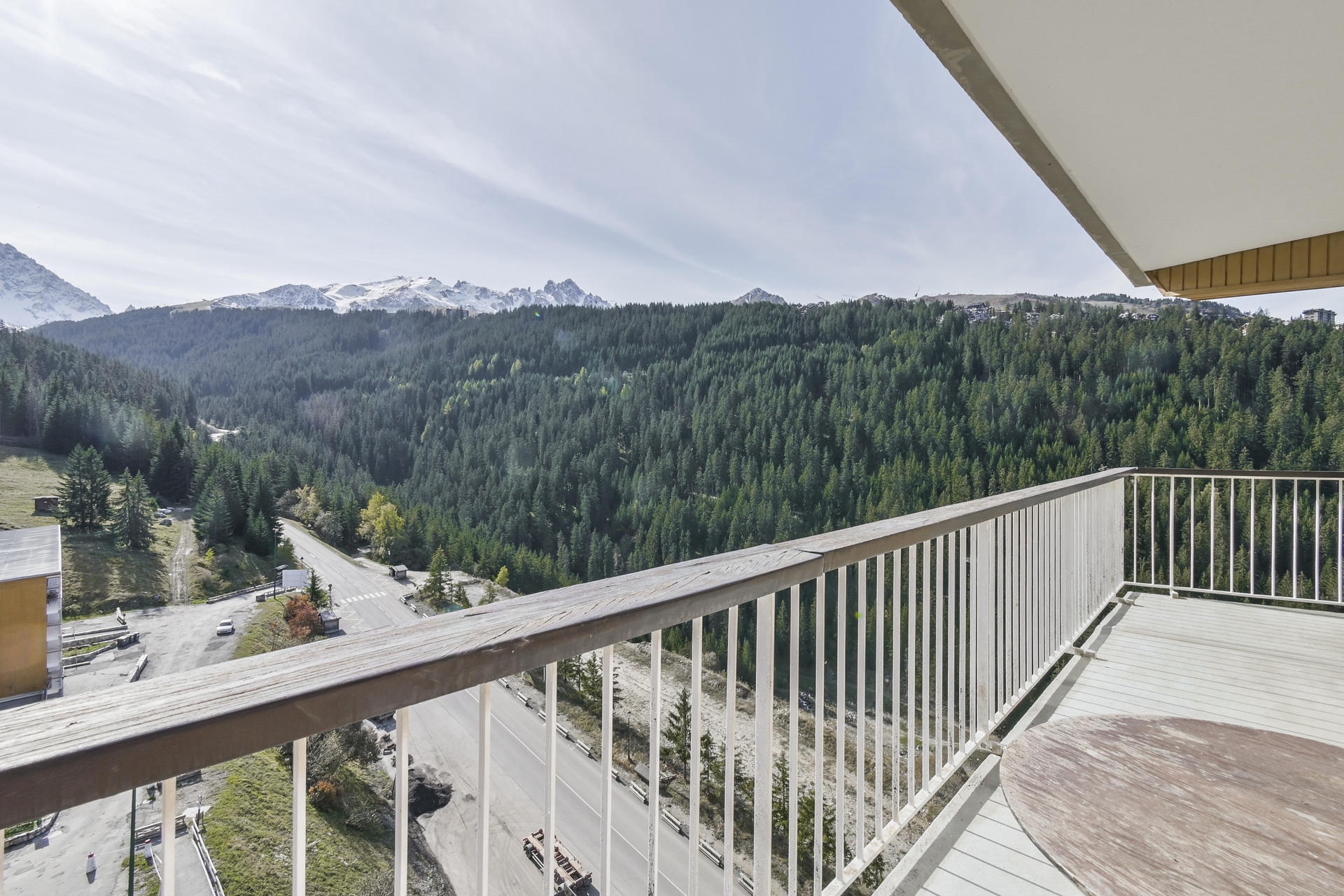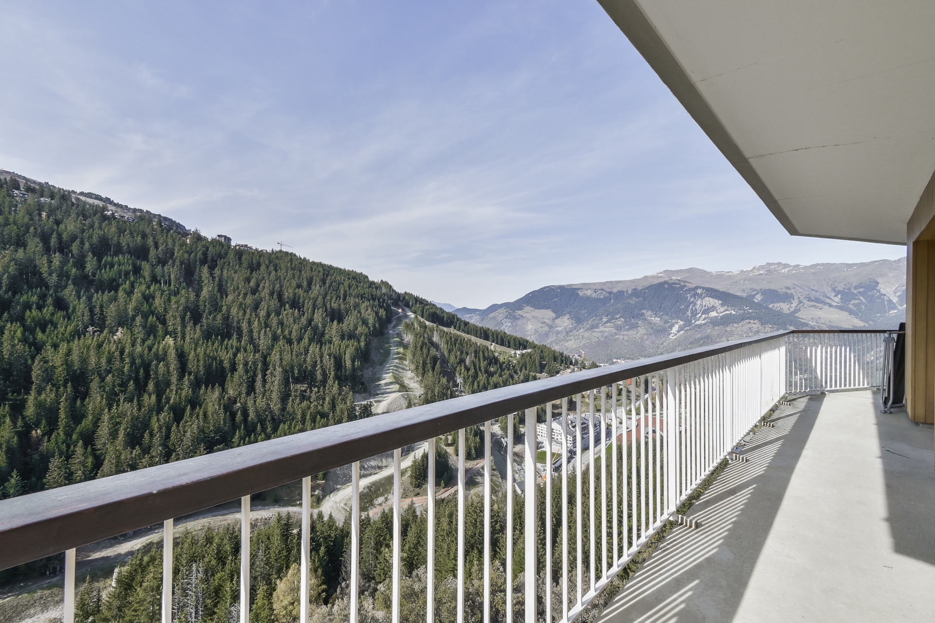 Balcon triple exposition Est, Sud, et Ouest avec vue sur la station et les montagnes.