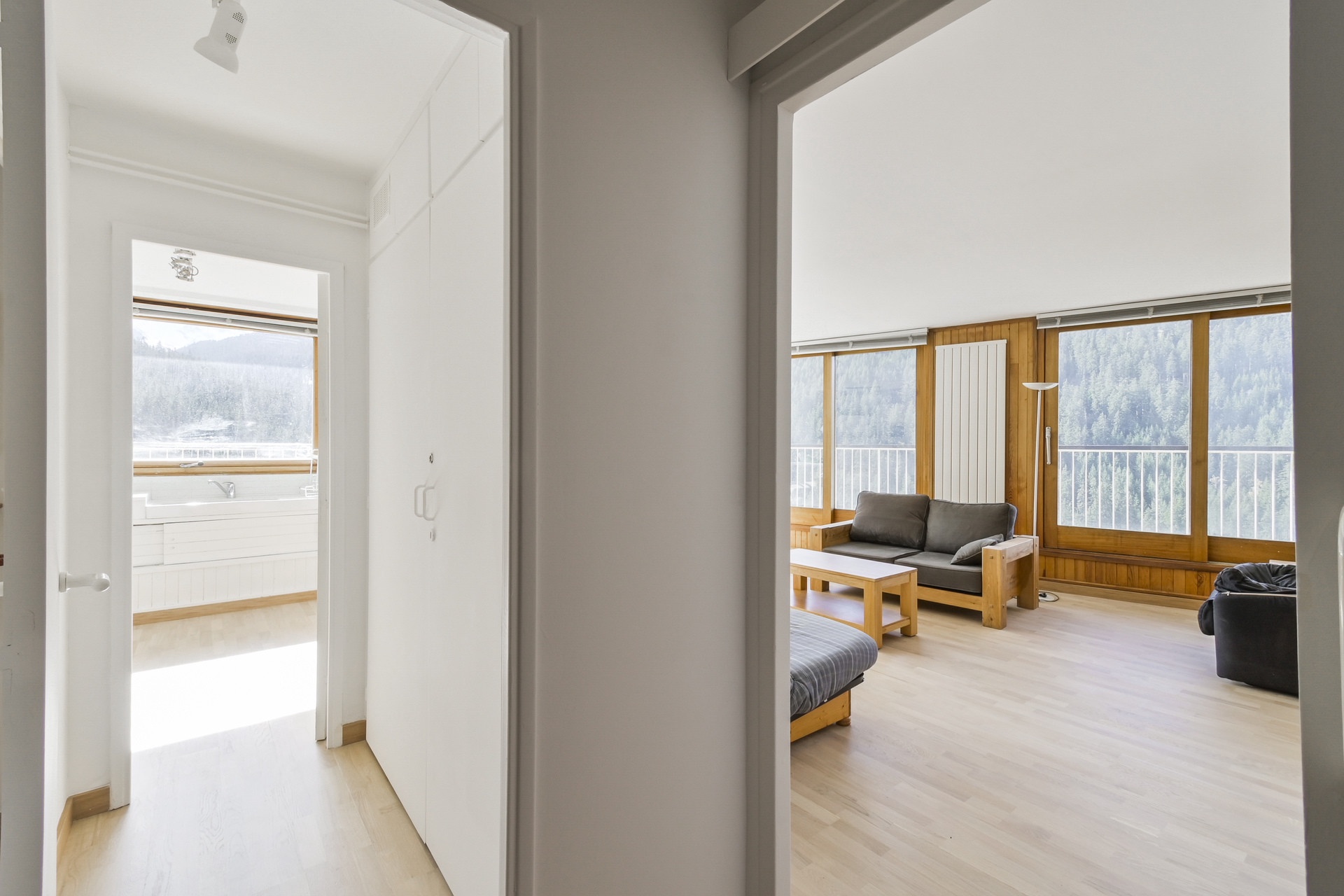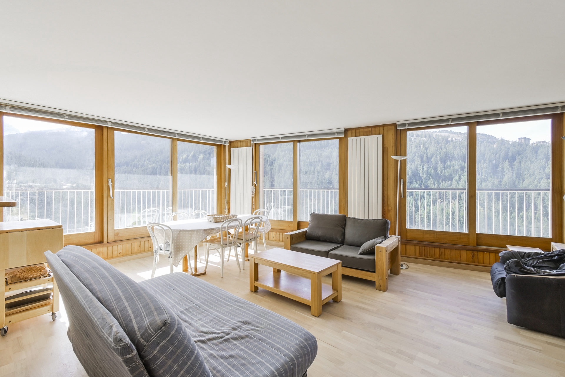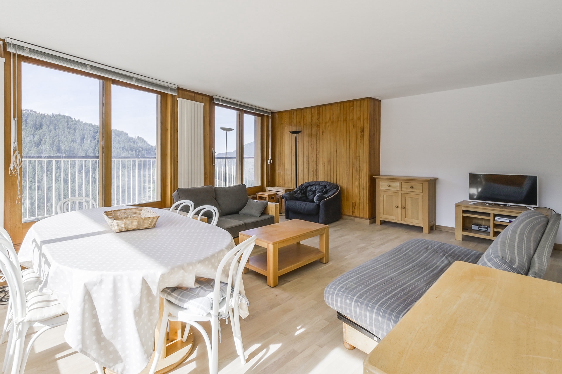 Balcon triple exposition Est, Sud, et Ouest avec vue sur la station et les montagnes.