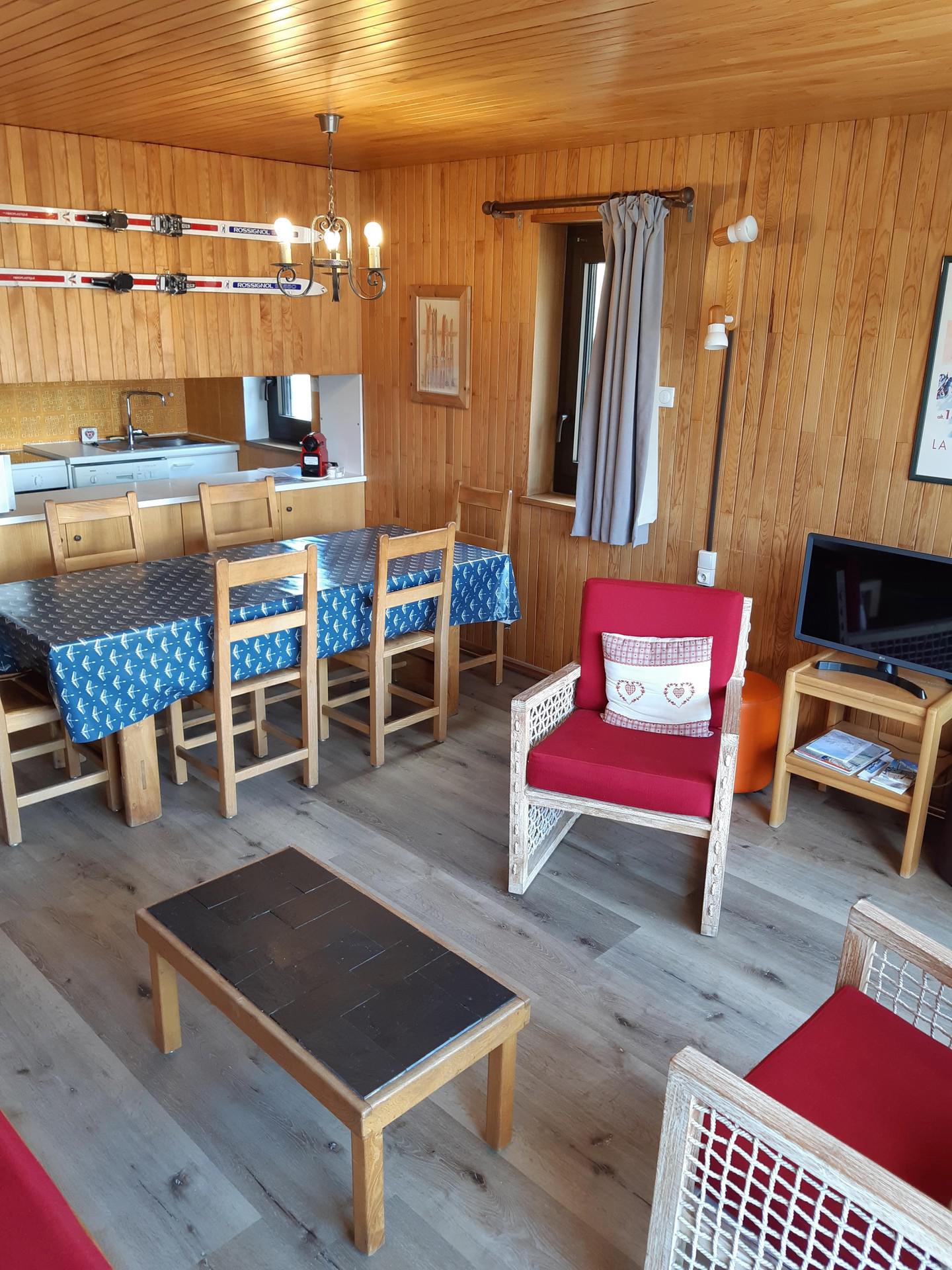 Pièce à vivre avec espace repas et balcon exposition Sud avec vue sur les pistes et sur la station. Télévision écran plat.