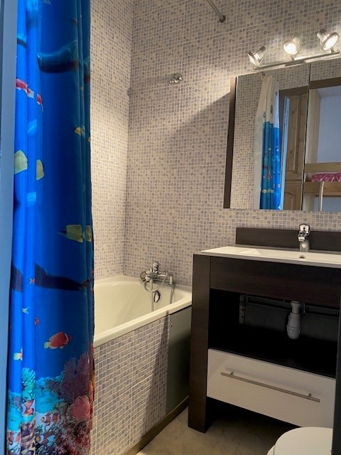 Salle de bain : Douche, lavabo et WC.