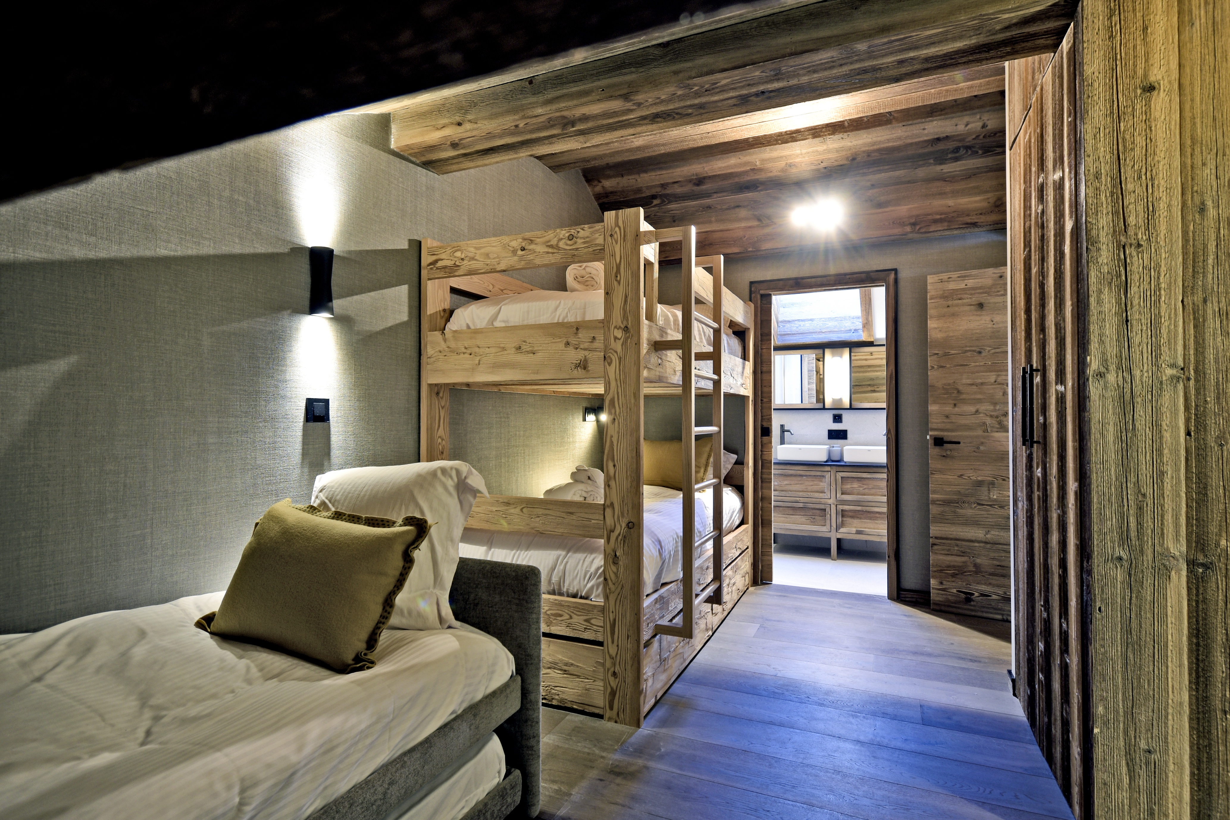- Chambre 4 : lits superposés (90x200), lit simple (90x200) et lit tiroir (90x200) et salle de douche avec double vasque et toilettes